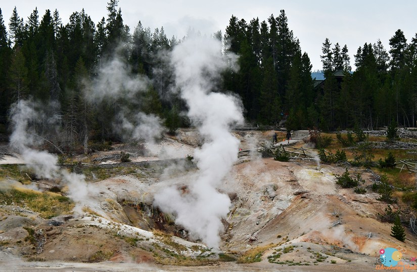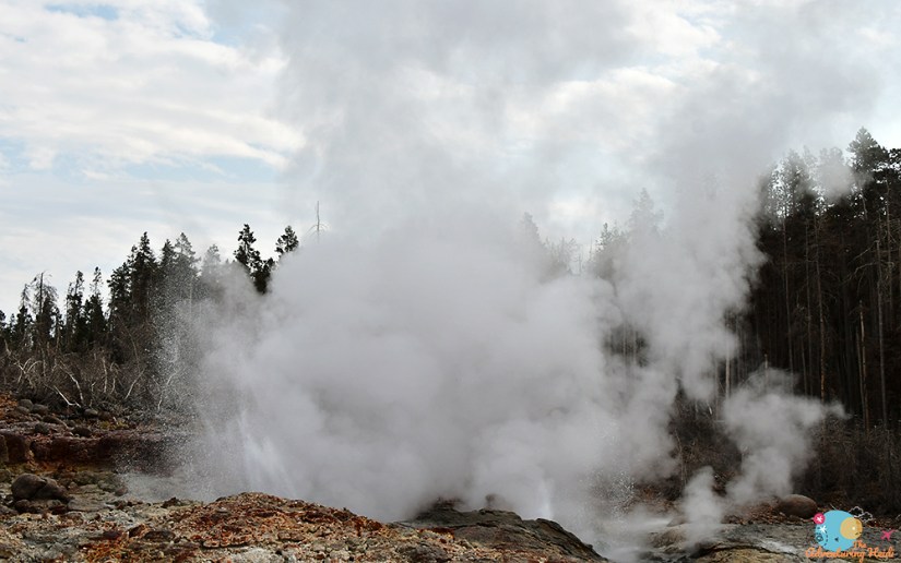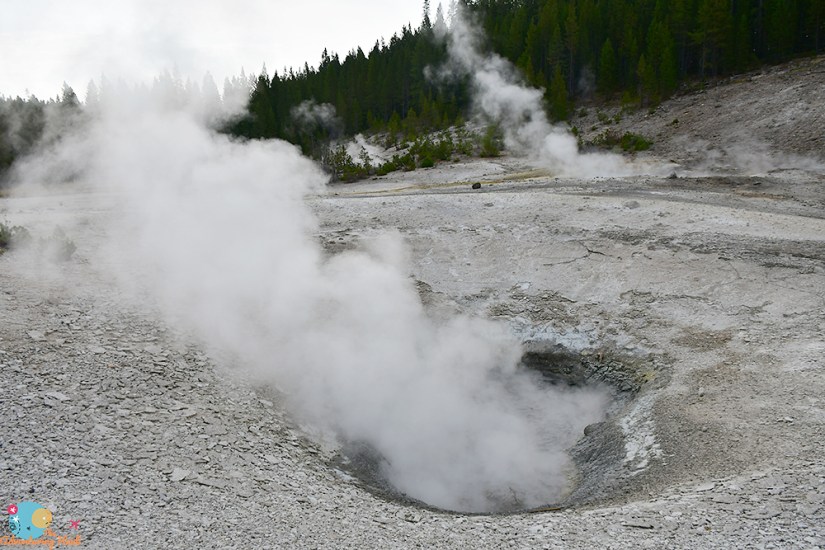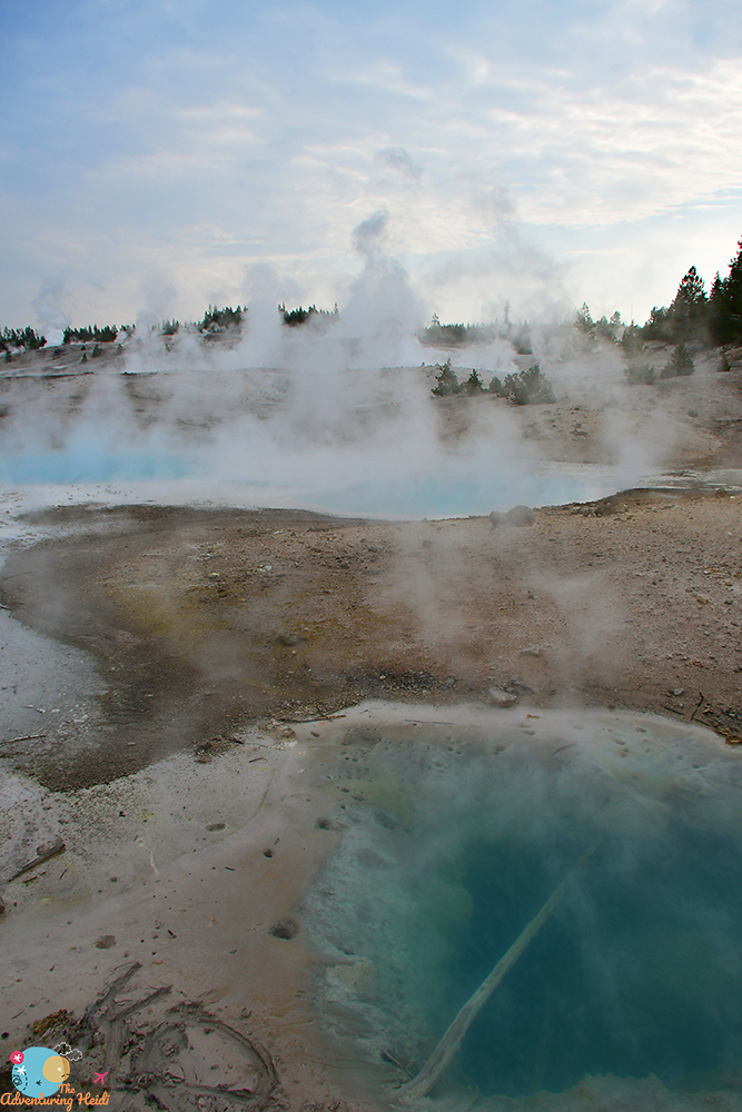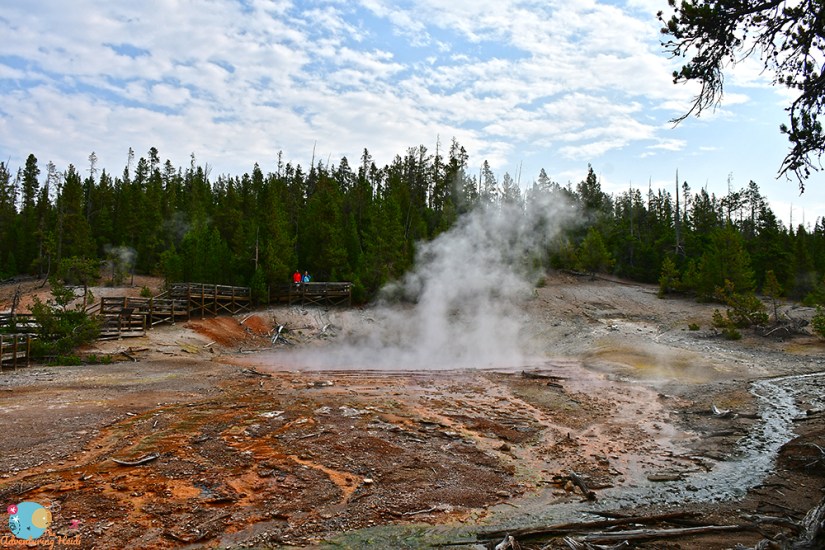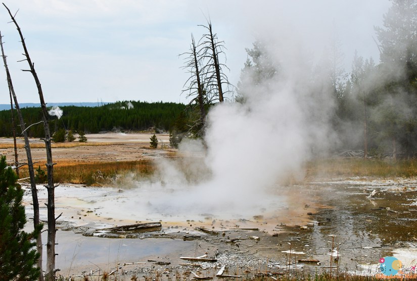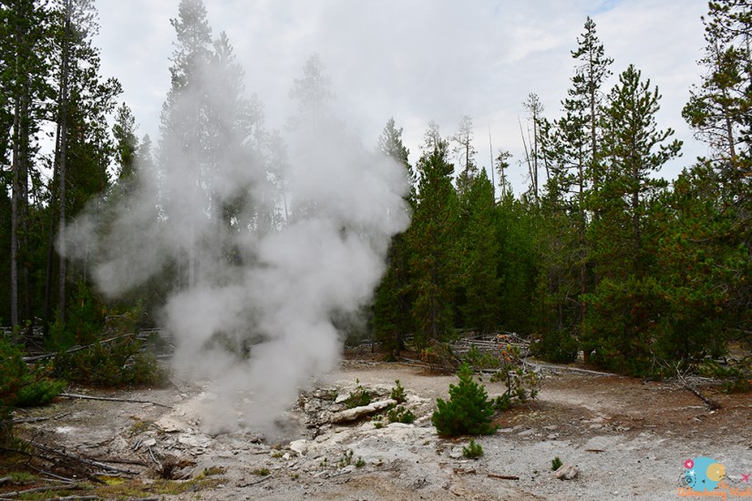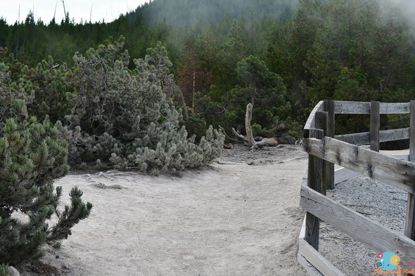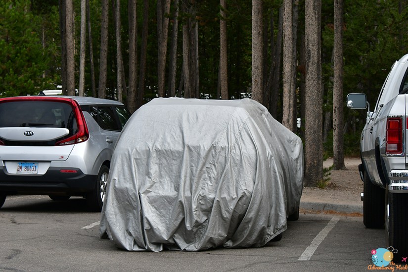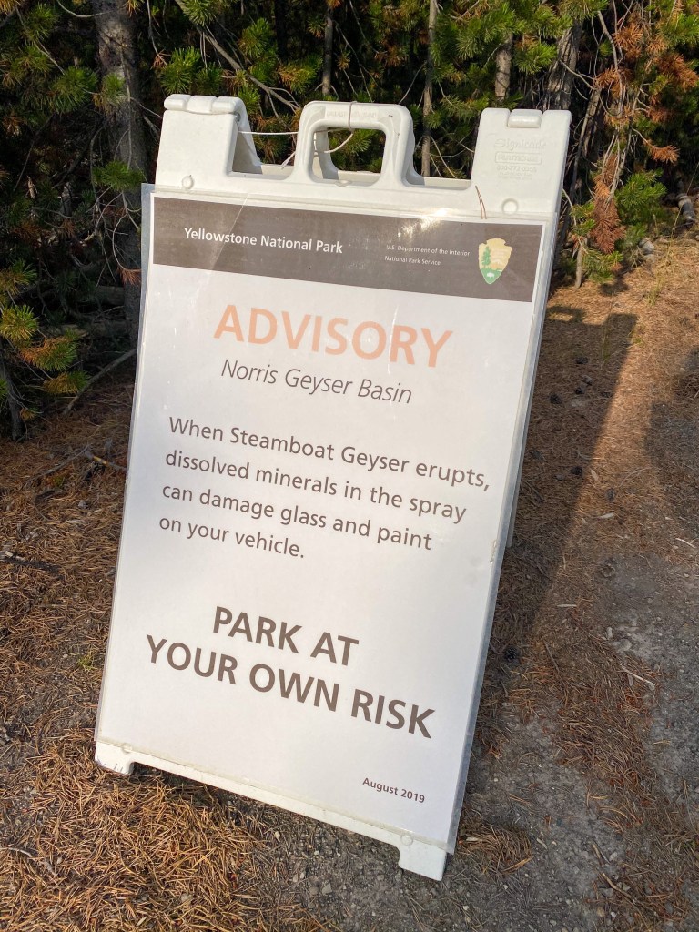 Upon pulling into parking at Norris Geyser Basin (which luckily still had plenty of spots – by the time I was done exploring, cars were having to circle the parking lot for spots, or had to park out on the highway and walk in), I noted the sign that my vehicle could be harmed by the minerals from Steamboat Geyser. Hmm. Then I noticed park rangers pulling on car covers, and other vehicles with towels and blankets over the glass and painted parts. So I love my car, so this heightened my concern, so I approached a park ranger who promptly told me if I cared about my paint, I probably shouldn’t park in the lot, as we were in the eruption window for Steamboat. I froze, debating if I should move my car. She then explained I was in the better parking spot, as the trees would block some of the mineral water. I decided to risk it… sorry Mr. Fozzy.