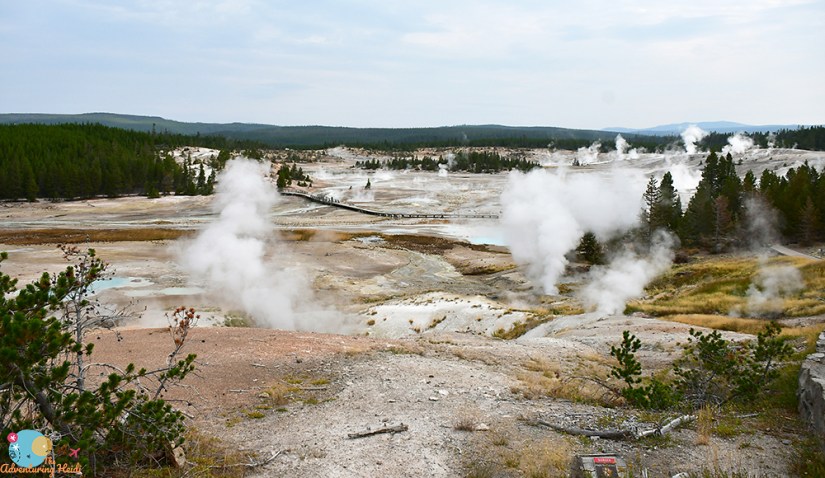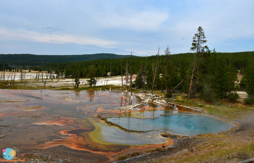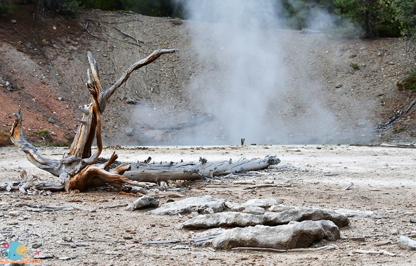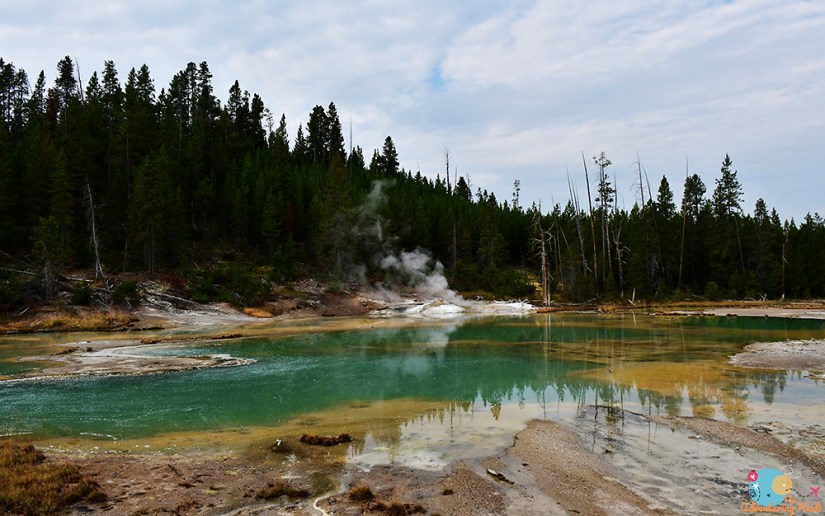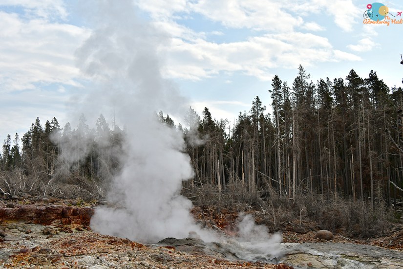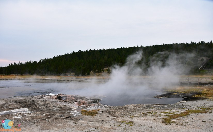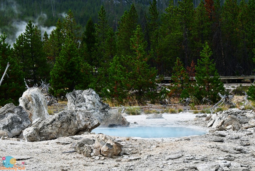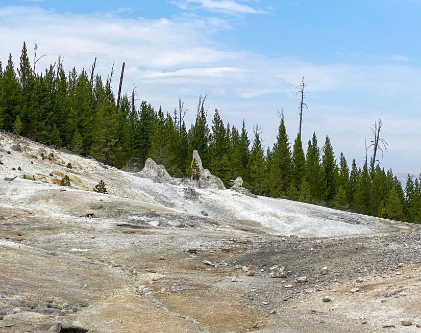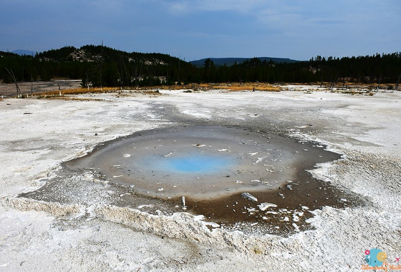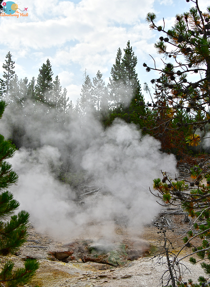 Upon pulling into parking at Norris Geyser Basin (which luckily still had plenty of spots – by the time I was done exploring, cars were having to circle the parking lot for spots, or had to park out on the highway and walk in), I noted the sign that my vehicle could be harmed by the minerals from Steamboat Geyser. Hmm. Then I noticed park rangers pulling on car covers, and other vehicles with towels and blankets over the glass and painted parts. So I love my car, so this heightened my concern, so I approached a park ranger who promptly told me if I cared about my paint, I probably shouldn’t park in the lot, as we were in the eruption window for Steamboat. I froze, debating if I should move my car. She then explained I was in the better parking spot, as the trees would block some of the mineral water. I decided to risk it… sorry Mr. Fozzy.