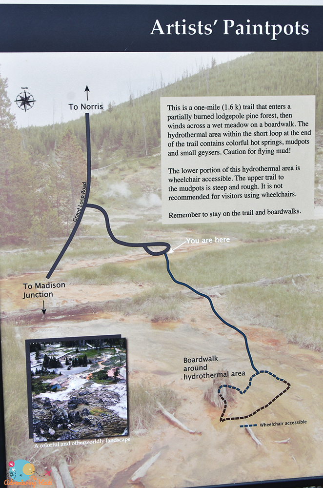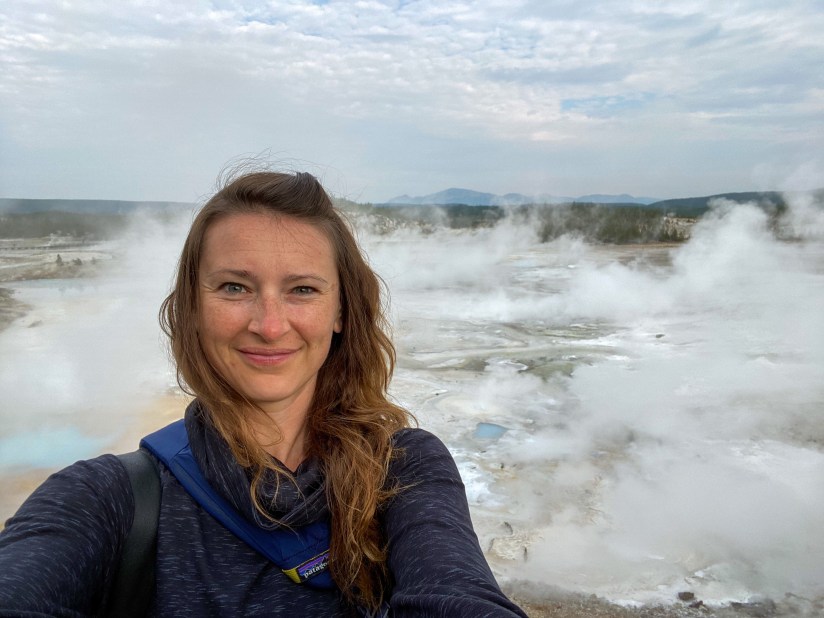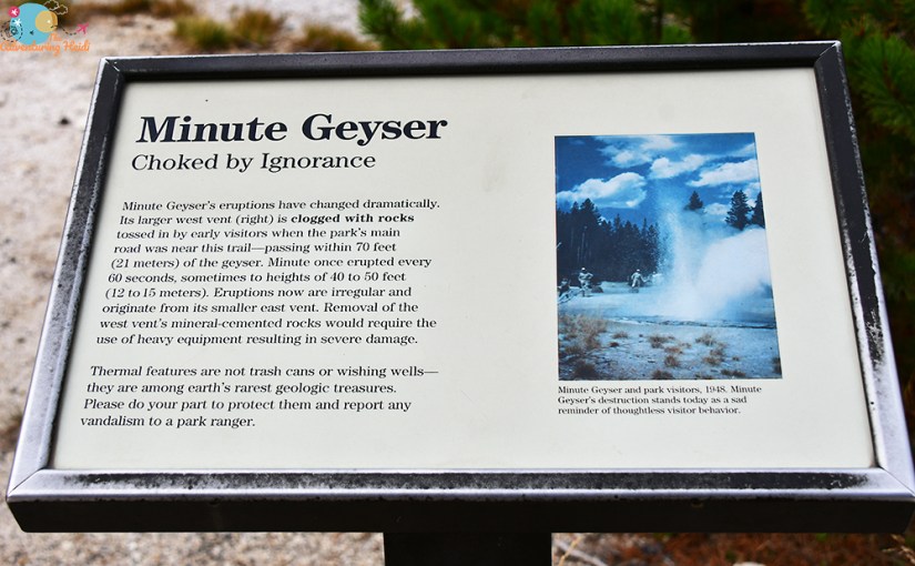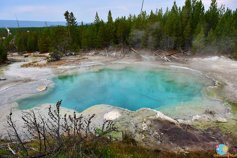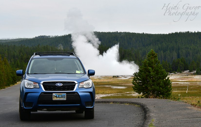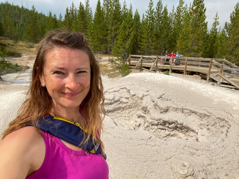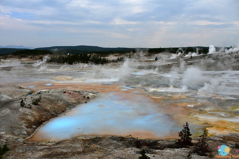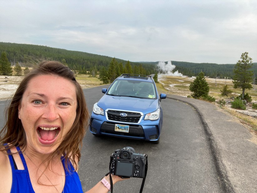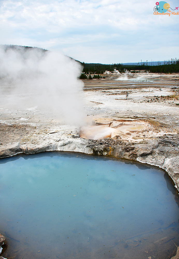 Upon pulling into parking at Norris Geyser Basin (which luckily still had plenty of spots – by the time I was done exploring, cars were having to circle the parking lot for spots, or had to park out on the highway and walk in), I noted the sign that my vehicle could be harmed by the minerals from Steamboat Geyser. Hmm. Then I noticed park rangers pulling on car covers, and other vehicles with towels and blankets over the glass and painted parts. So I love my car, so this heightened my concern, so I approached a park ranger who promptly told me if I cared about my paint, I probably shouldn’t park in the lot, as we were in the eruption window for Steamboat. I froze, debating if I should move my car. She then explained I was in the better parking spot, as the trees would block some of the mineral water. I decided to risk it… sorry Mr. Fozzy.
