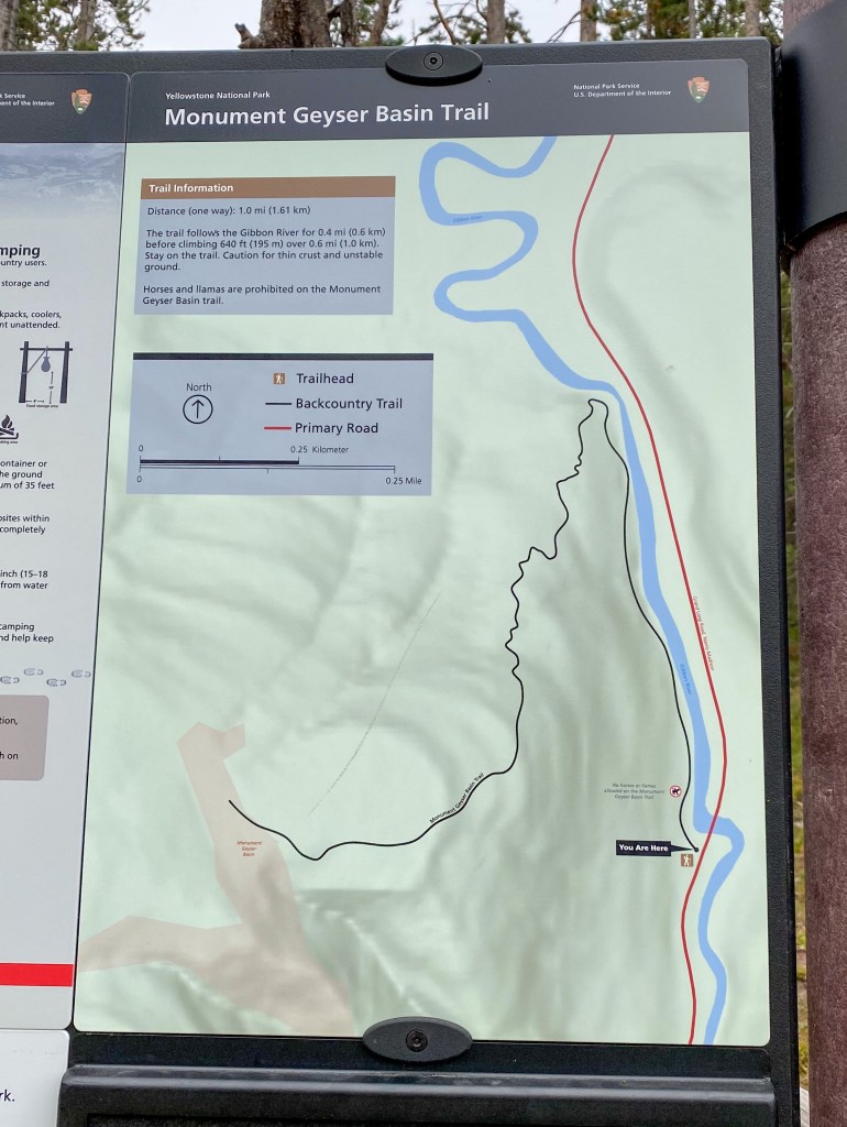I was only back in the car a short while before arriving at the trailhead for Monument Geyser Basin. This is a short hike, but crazy steep, which makes it seem like a lot more than two miles. Because I had cut out a hike from this morning’s itinerary, I felt like I had to do something, so off I set.