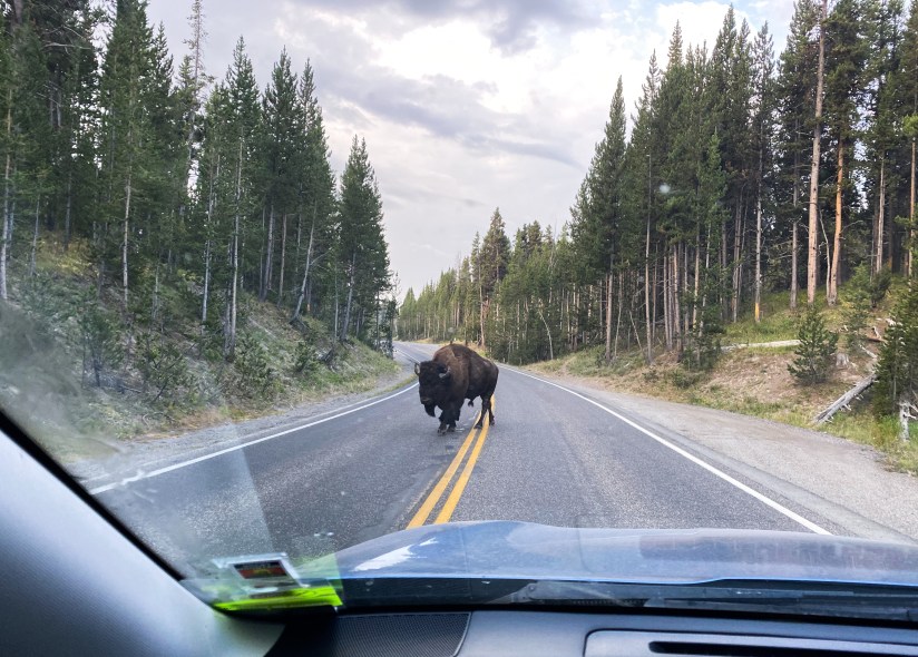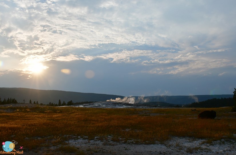 Because I still didn’t want to go back to the campsite, I ended up driving all the way south to Old Faithful. Here I had cell service, so I used the opportunity to call my parents while I sat at Old Faithful watching a bison with dozens of others. I had just missed an eruption, but I hung out for awhile, enjoying some cell service and grabbing some photos. I decided I didn’t want to wait the 90 minutes to catch Old Faithful at sunset, as I had this whole geyser basin on the itinerary in two days, so I grabbed some gas (which was reasonably priced, much to my surprise for being in a remote national park and all) and headed back to my campsite.