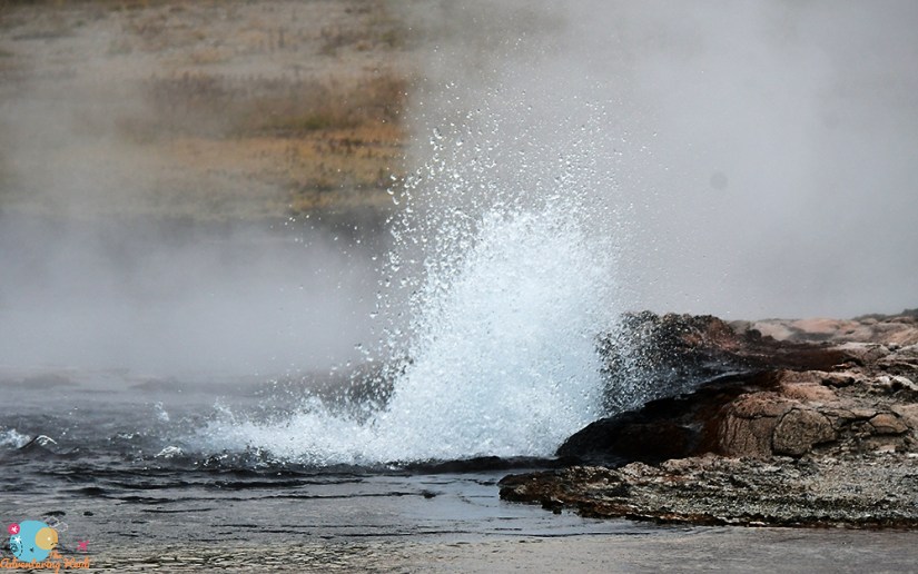 Since I had daylight left and nothing else to do, I continued south, and turned onto the Firehole Lake Drive, another one way loop that takes you to some awesome geothermal features. My mood perked up, and once again the sunroof was opened, wind blowing my hair around, and I had a huge smile. I mean, how often can I get a photo of Fozzy with a geyser in the background, or a pretty blue hot spring?! Also, since it was evening, there was not a lot of traffic so I was able to have some peace and quiet, unlike in other areas.
