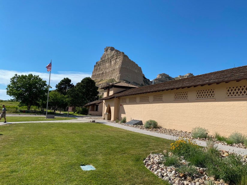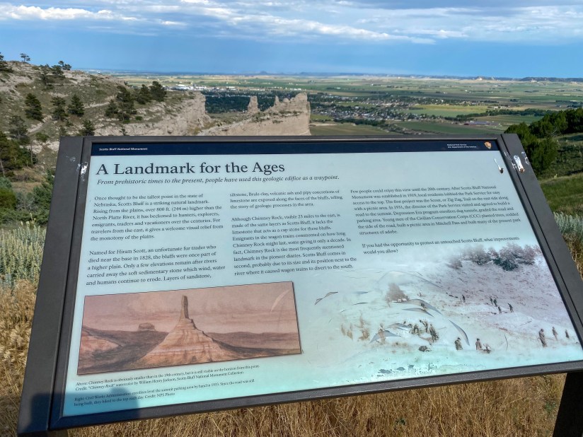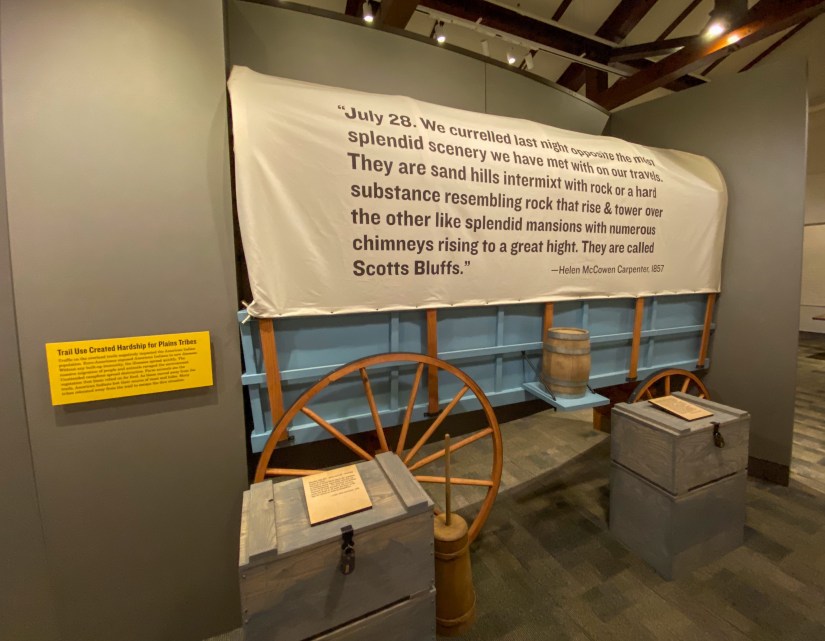 Scotts Bluff is an 800-foot prominence that was a very important landmark on many of the historic trails criss-crossing the western United States in the mid-1800s – the Oregon Trail, Pony Express Trail, California Trail, and Mormon Trail. The area was designated a national monument in 1919. Today there are four miles of hiking trails (which we didn’t explore, because you know, 100 mile bike race the next morning we needed to save our legs for!), a narrow drive to the summit, and a really awesome, interactive visitor’s center and store.