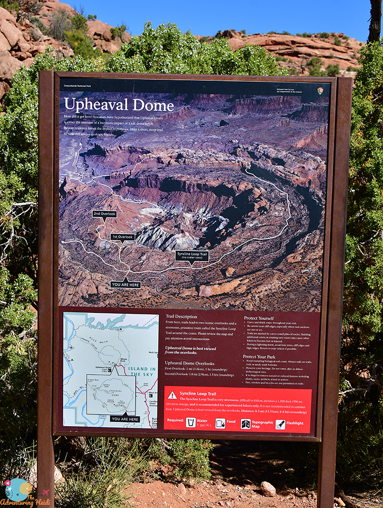 Upheaval Dome is interesting from a geology nerd aspect. According to the NPS website, “In the area of Upheaval Dome, approximately three miles (5 km) across, rock layers are dramatically deformed. In the center, the rocks are pushed up into a circular structure called a dome, or an anticline. Surrounding this dome is a downwarp in the rock layers called a syncline. What caused these folds at Upheaval Dome? Geologists do not know for sure, but there are two main theories which are hotly debated.” A 1-mile trail leads you to a viewpoint. Sarah and I opted not to take the trail as our legs were tired and it was uphill.