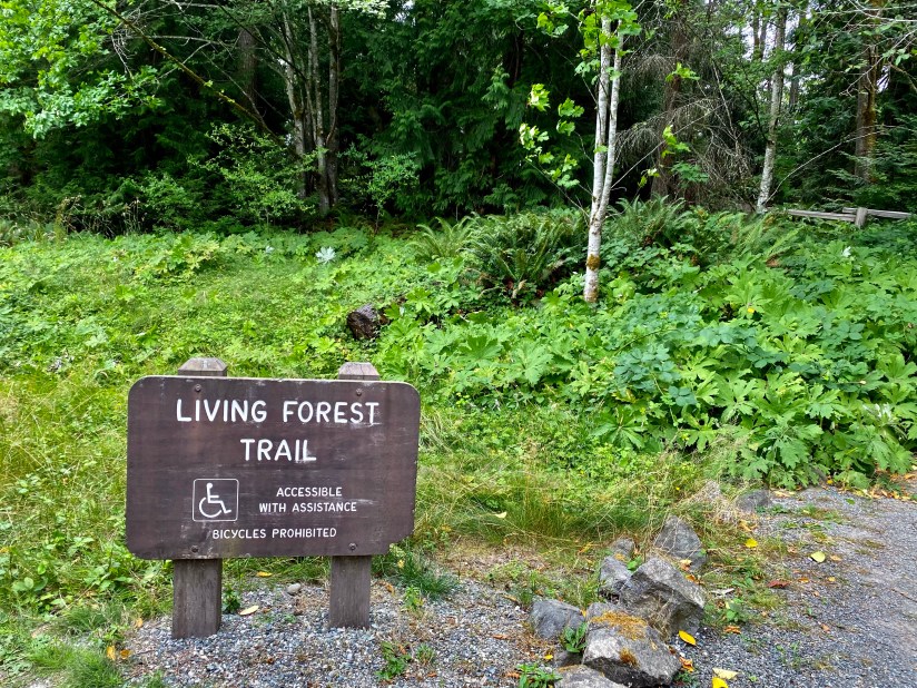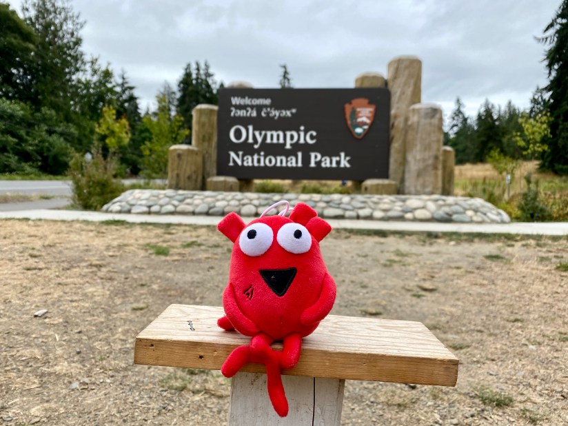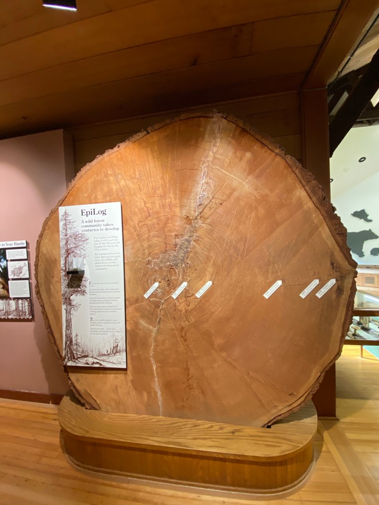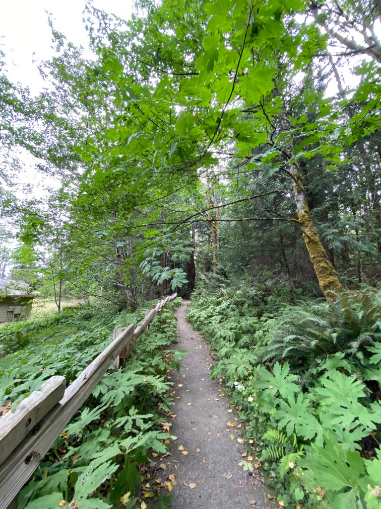 Next up was the visitor center at Olympic National Park on the north side of Port Angeles. First up was my entrance sign photo, and then passport stamps and a souvenir magnet at the gift shop. We then walked the entire Living Forest Trail that is behind the visitor center, and is definitely worth the time! The trail is 0.4 miles long and is accessible with assistance. Being the dry, arid Wyoming girls that we are, we marveled at how prehistoric everything seemed (and I kicked myself even harder for forgetting the Adventure Dinos at home), with the lush greens and smell of decay.