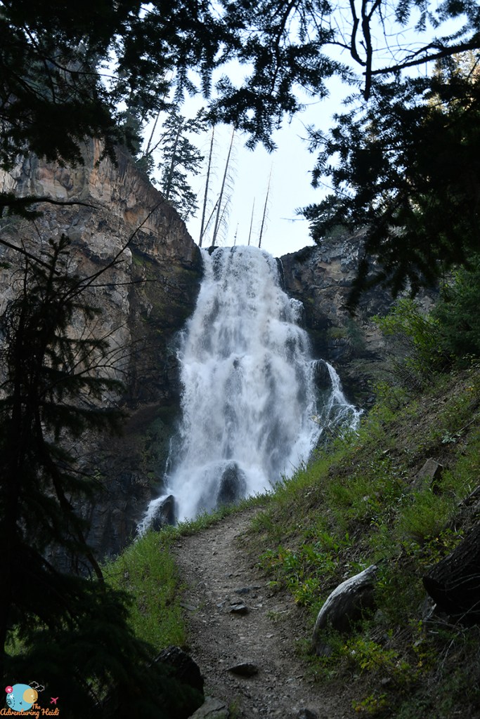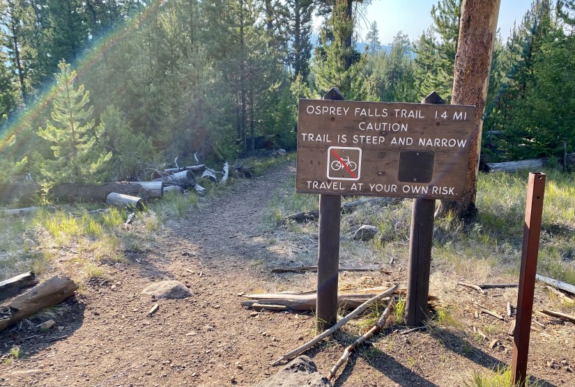 At the Bunsen Peak Trailhead I readied my bike and pack, and had a nice chat with a gentleman who was going to the falls and then to the top of Bunsen Peak before setting out. Though the double track trail ascends from the parking lot, it was an easy ride on my gravel bike (definitely not a “mountain bike only trail” but I’m not sure I would’ve done it on a road bike either), and I was thankful to see the miles fly by that otherwise would’ve taken quite a long time to walk. This bike/hike is about nine miles as an out and back (you can make it longer by heading up to the summit of Bunsen Peak, but bikes are not allowed on that trail).