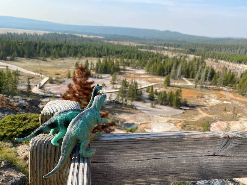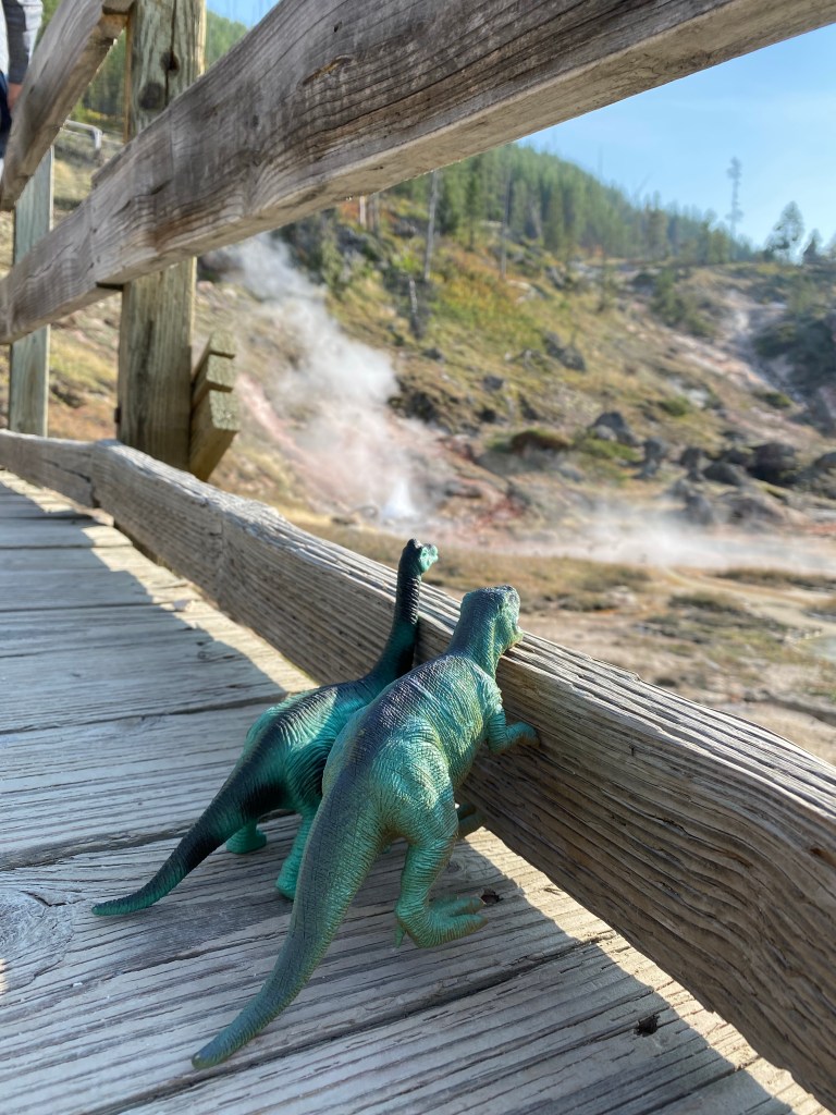 Last up was a stop at Artists Paintpots, which can be oh so crowded. Luckily I scored a parking spot easily and didn’t have to deal with the craziness of peak hours. Last year during my trip I had a scare with my car keys here where I thought I had lost them and had one of the most panicked moments of my life, so I carefully stashed them (and checked five times over that they were really zipped securely in my pocket), and then grabbed the Adventure Dinos and set out. Because every nearly-40 year old should hike with toy dinosaurs.