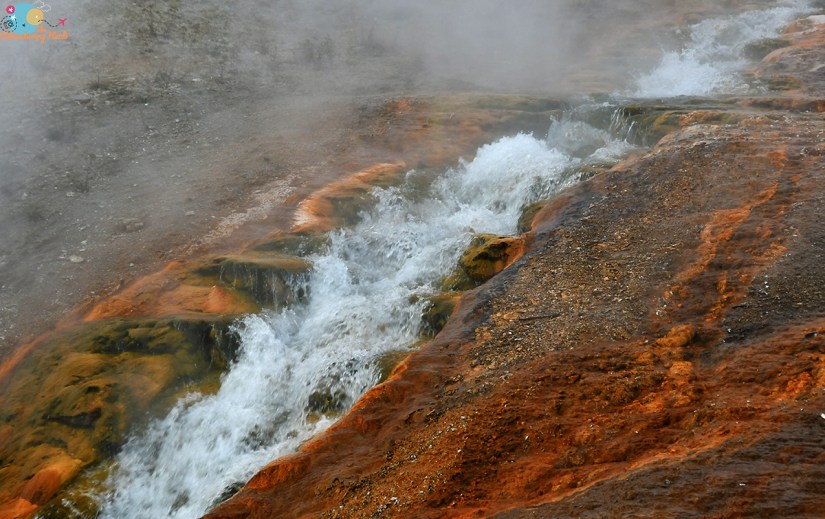 After my jaunt around Midway, it was time to explore Biscuit Basin, which is one of my favorite geyser basins. My main goal was to get to Mystic Falls. When I visited last summer, I hiked up to Mystic Falls in the late afternoon, which meant I was shooting into the sun at the waterfall. I knew the morning would be better in the lighting aspect, so I was super excited to head one of my favorite waterfalls. But of course, I had to explore some hot water first, which included “yogging” (running without actually running as I call it, because I’m clumsy and running sounds a bit too dangerous around boiling water) towards a playing Mustard Spring which I spotted from across the boardwalk. Of course, a watched pot never boils, and it stopped playing once I was in front of it and I finally gave up watching.