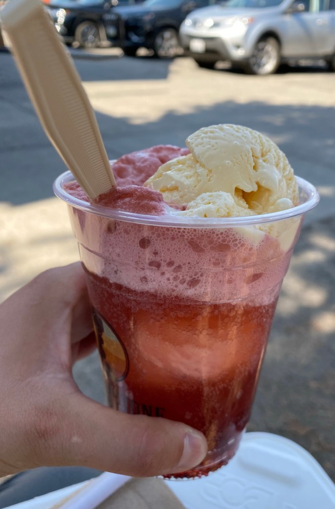 After Grand, I watched Sawmill a bit more, and then wandered a little around Geyser Hill before heading back to Disney World, I mean, the area around Old Faithful. I stopped by the photography store for more passport stamps, and got in line for a snack. Sadly there was no huckleberry ice cream to be found, but I did get a huge flatbread pizza and a huckleberry float.
