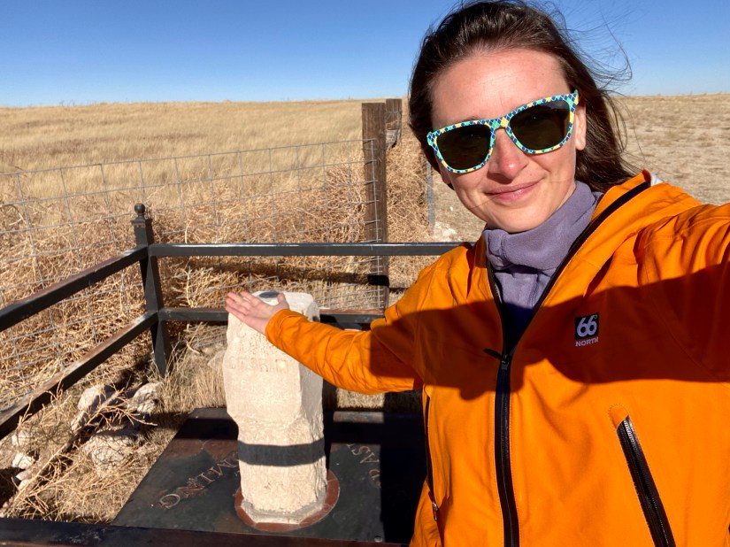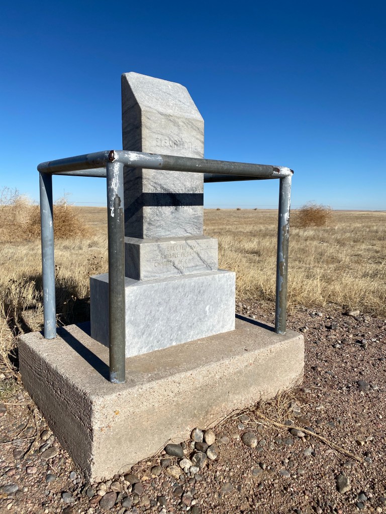 A dusting of light snow coated Cheyenne, but the roads dried up as I headed east on I-80 toward Pine Bluffs. Panorama Point was not the first stop planned – first I’d be going to the “tri-state marker” where Nebraska, Colorado, and Wyoming come together (one of ten tri-state corners in the United States). This location is on the same property as Panorama Point, but there is not direct way between the two since it is an active bison ranch. Luckily, it is on Google Maps under “CO-NE-WY Tri-State Marker,” and is easy to find when heading south on Laramie County Road 165… just turn left immediately after the missile silo! (I’m not making that up!)