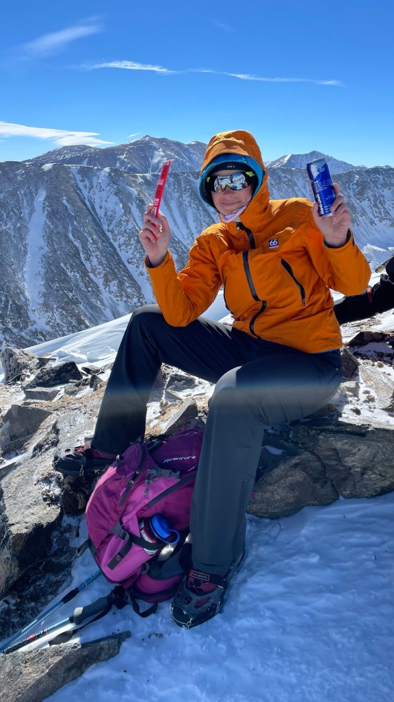 This climb got hard for me fast. It had been years since I had been at this altitude, and about 13,000 feet I was feeling it. Which in turn frustrated me, as I didn’t expect to not feel good. I took turns laying on the ground whining, before continuing on. I debated more than several times calling the hike and telling the others I wanted to turn back. Mentally, I was getting destroyed and suddenly I was questioning ALL my 2022 climbing plans. Why did I buy mountaineering boots again!? Even worse, the windchill meant I didn’t want to risk drinking my precious Red Bull while freezing my fingers, which is always my motivational treat (and altitude headache cure) on 14ers.