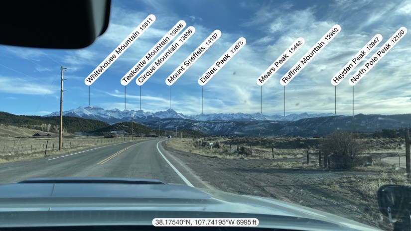 The views kept on coming as we wound our way towards Montrose, and then turned south with the San Juan Mountains on full display. I am hoping I can take a trip later this year to the San Juans to knock off a bunch of climbs, so I enjoyed searching for my future summits on Peak Finder, rambling on about “Uncle Padre” and “Sniffles.”