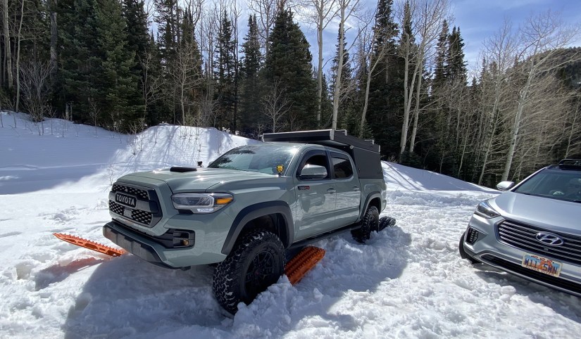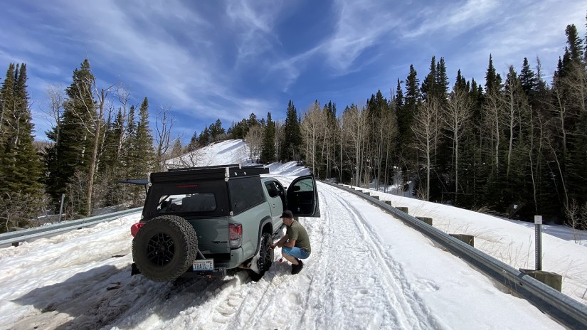 Weren’t we just in the desert, and now we’re standing in snow in sandals?! Eric aired down the tires and we gave the road a go with the Maxtrax, and I dug out some more appropriate footwear since Chacos and snow make a chilly combo. Just as we passed their car, Colette put Eric on the phone with the tow truck driver, who warned us not to try to continue (we are unsure if he knew we were in a capable vehicle, or was a local who was in the know on what lied ahead). We sighed, admitted defeat, and turned around after exchanging phone numbers and making sure our new friends had water and snacks.