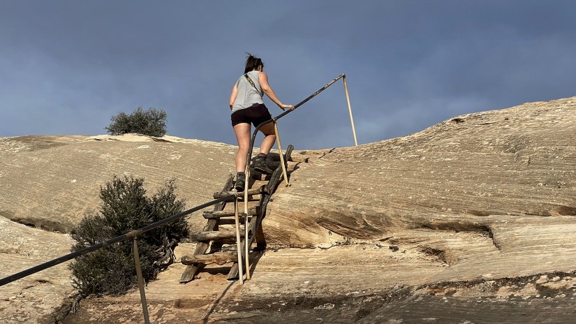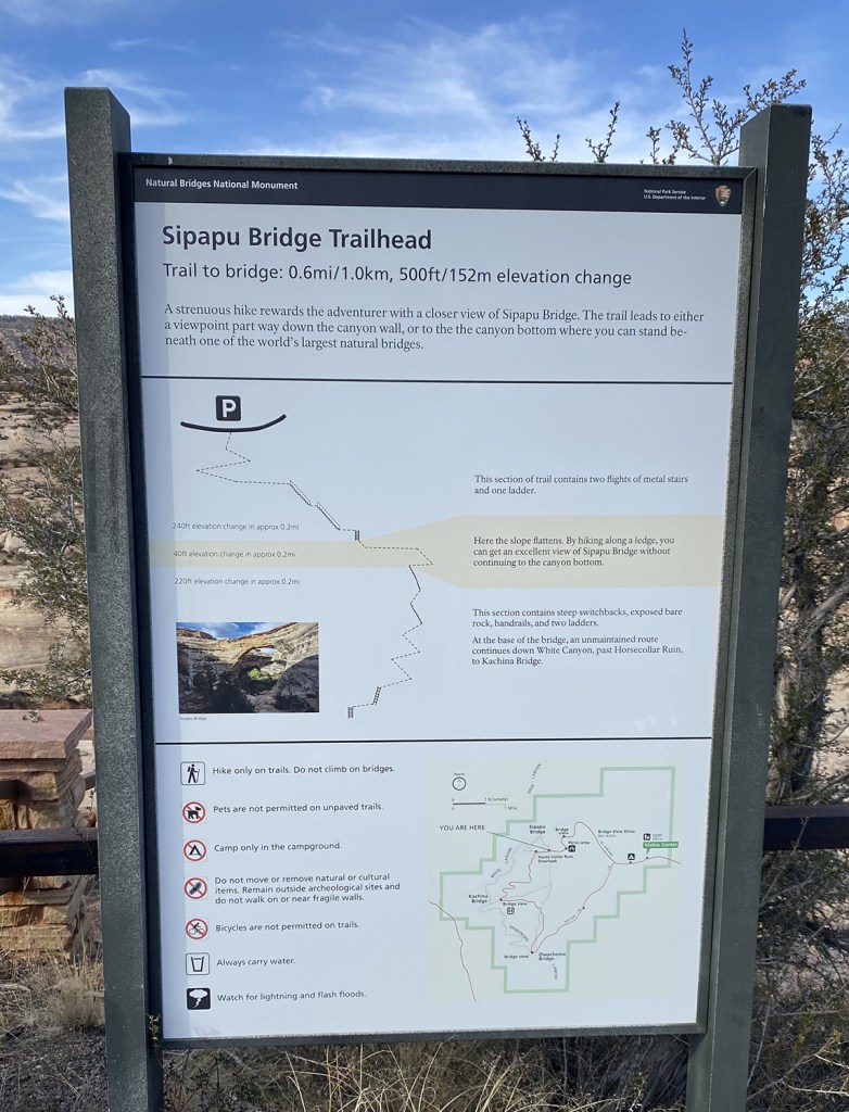 I wanted to hike a bit, so we drove on to the trailhead for Sipapu Bridge and set out on the hike down to the bridge. The hiking in the monument is kind of limited compared to other larger NPS units, but also a bit of choose your own adventure, as you can hike to each bridge individually in short chunks of 05.-1.5 miles, or do a 12-mile long loop to see all three. Sipapu Bridge is about a 1.5 mile round trip hike, but with 500 feet or so of elevation gain to climb on the way back to the car. Both Sipapu and Kachina hikes involve ladders and some steep stuff.