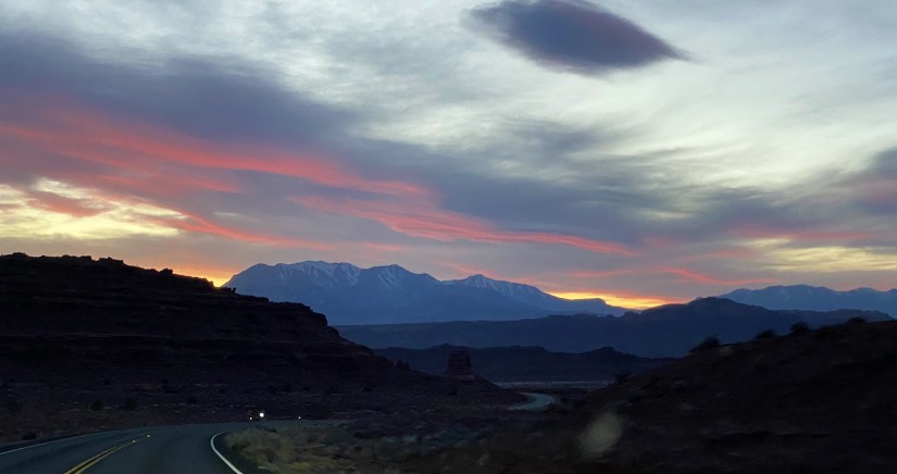 West we headed, driving past the La Sals (my first time seeing them from this direction), crossing into Utah, and soon entering the familiar desert scenes common to the Moab area.