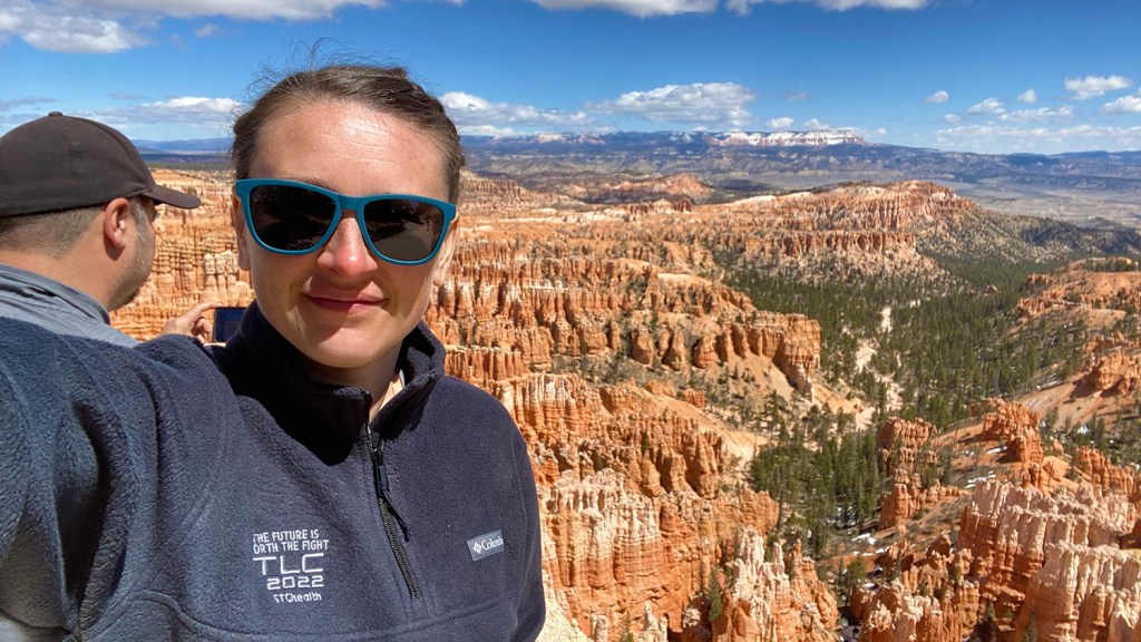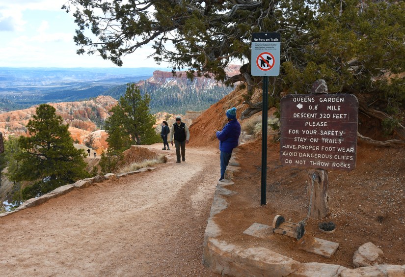 We made our way to the Sunrise Point and found a parking spot near the lodge. Because some trails were still closed due to winter conditions (Bryce Canyon is quite high in elevation… 7500-9000 feet!), we opted to do the loop of Queen’s Garden and Navajo trails, which is about three miles total. We opted for clockwise, which is the direction recommended by NPS for the best views and experience with descending and ascending. This is touted as the most popular hike in the park, and the crowds made it seem that way for sure!