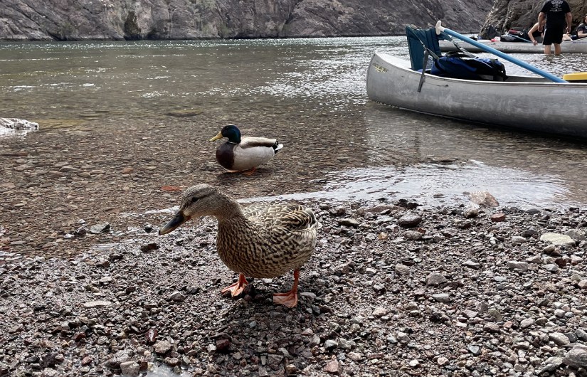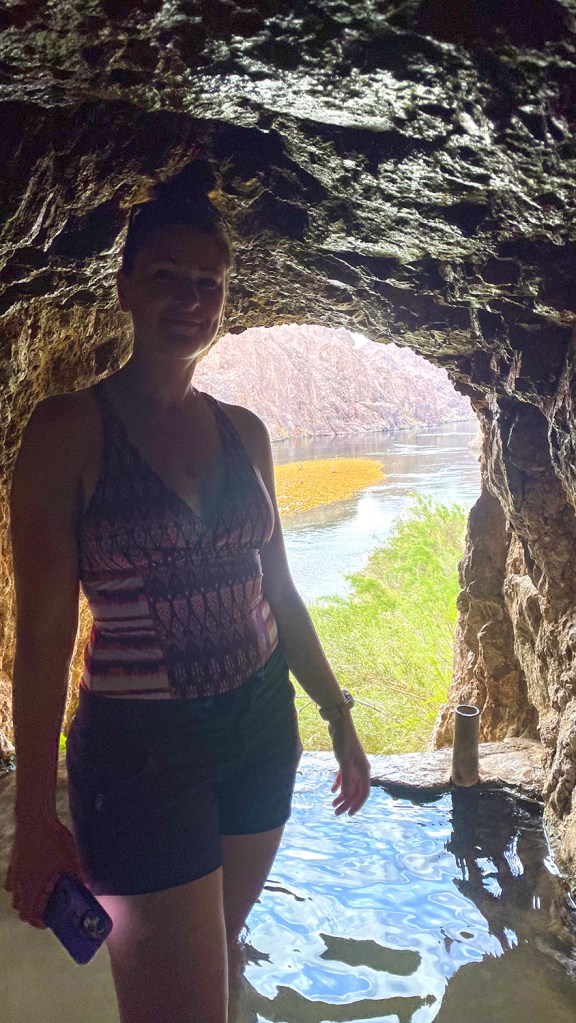 It was not long at all, in fact within sight of the launch point, that we arrived at the first “destination” of the day on the canyon banks – Sauna Cave. This was a tunnel created by drilling during the construction of the Hoover Dam, but it was abandoned when they encountered intense heat. Now it is a cave you can wander back through knee depth thermal waters. We had a big family on an annual canoe trip who launched after us arrive nearly at the same time as us, so we quickly took some photos and headed on our way.