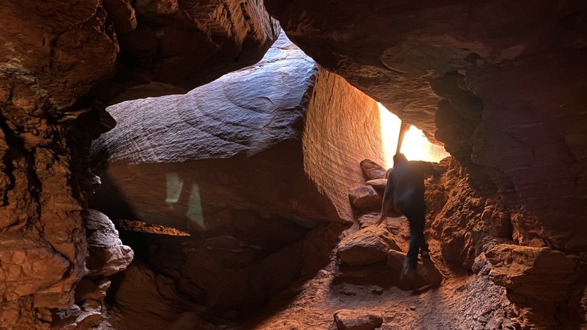 Our first big stop was a rock formation dubbed the Moab Wind Cave. Erosion created endless paths, tunnels, and caves to explore in the formation. It is quite a popular area, with tour groups stopping here.