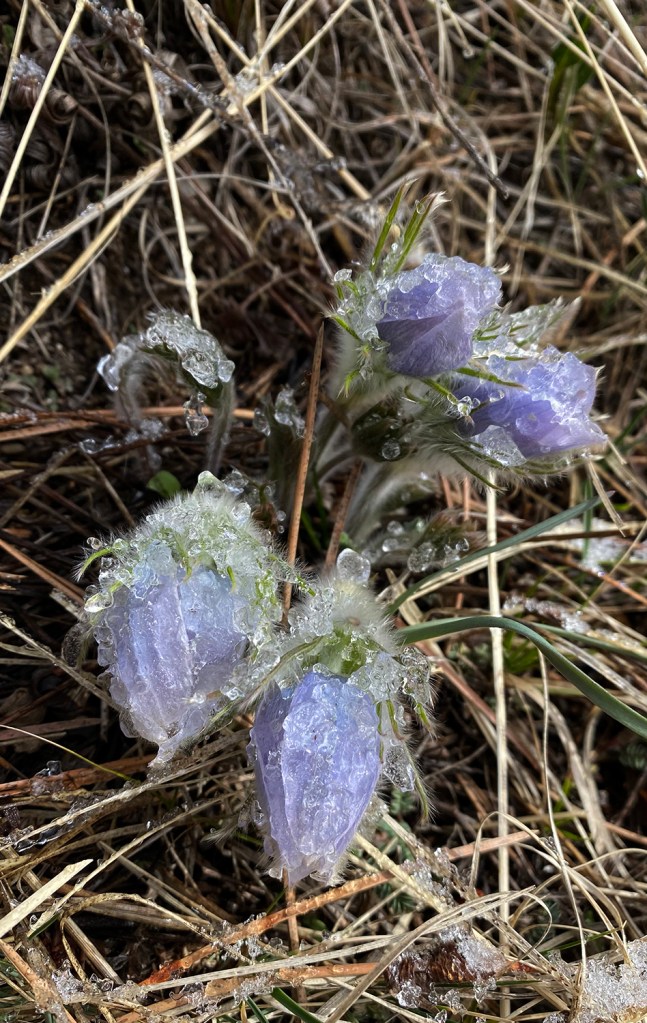 After a bit of uphill, the trail flattened through a meadow, and we enjoyed the pasque flowers that were blooming, albeit a bit frozen thanks to a light dusting of snow overnight and the cold temperatures. There’s just something about the first wildflowers of the spring!