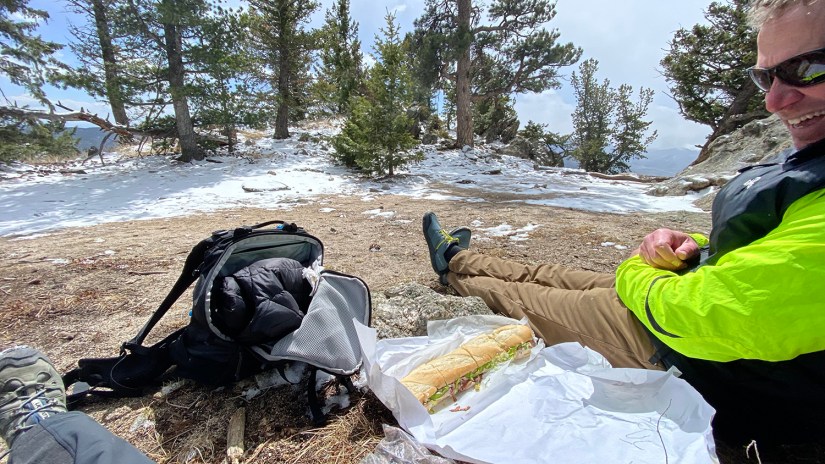 On the summit we scrambled to the very top, tapped the geodetic marker, and snapped some photos of a storm-enveloped Longs Peak. By now I was feeling a bit wiped out, maybe from the elevation or the fact it was a very long hike for me. Just when I was about to get real sad, Tom whipped out a massive two foot long sandwich from Obee’s in Fort Collins out of his pack!