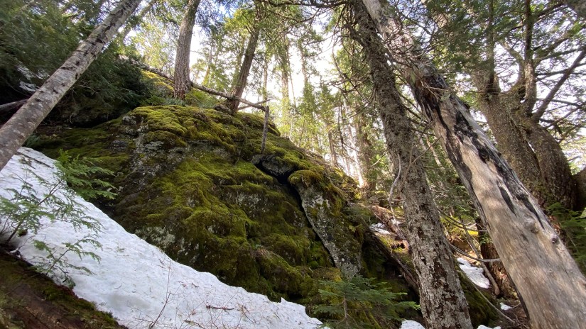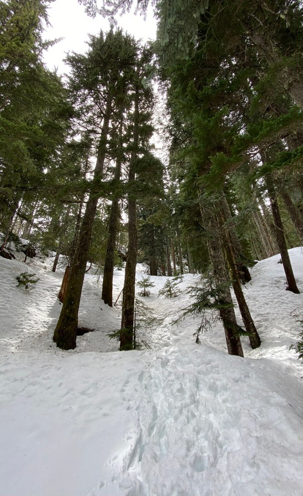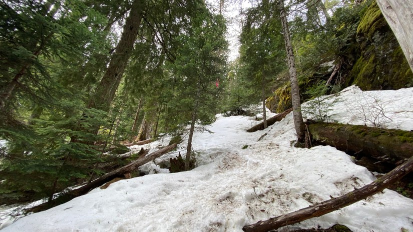 The snow was still decently solid so I took to kick stepping and did not have to put on my microspikes. After spending the entire hike sweating it up in my mountaineering boots, I was happy to finally run into some snow! The trail seemingly was not as steep as the previous miles. It even snowed ever so gently. I started feeling a tinge of a headache, leading me to wonder if literally all my altitude acclimation disappeared in a matter of a week (I think I probably just needed to hydrate better after sweating every electrolyte out of my body on the hike up).