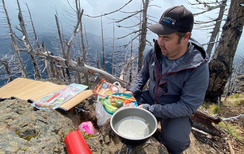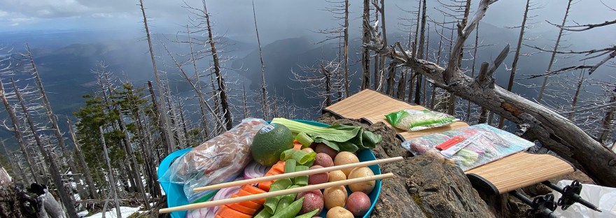 As Jen and I finished up playing on the true summit, we joined Eric in preparing the summit meal. This was meant for Mount Saint Helens, but alas, lemonade! We’d have a hot pot, complete with all the fresh veggies and tasty, salty broth! Jen tossed our summit champagne in a snowbank to chill.