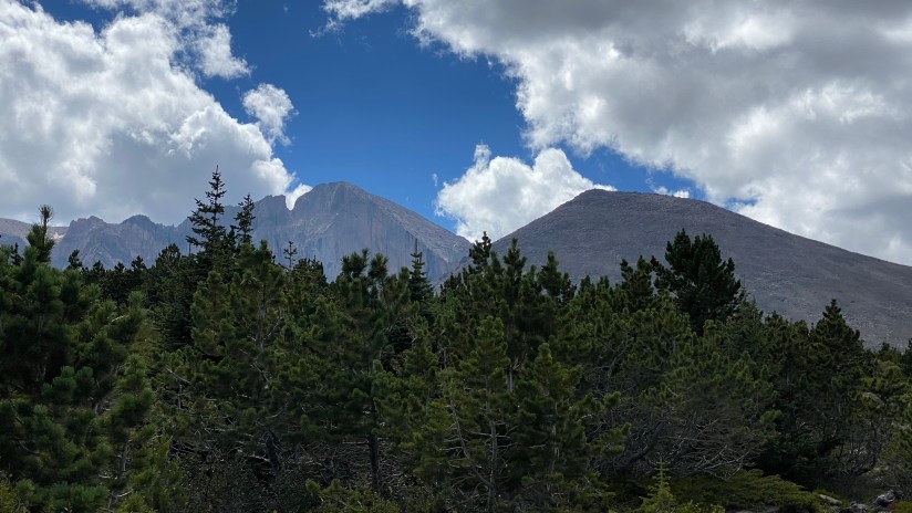 Longs Peak coming into view as we neared treeline, along with Mount Lady Washington