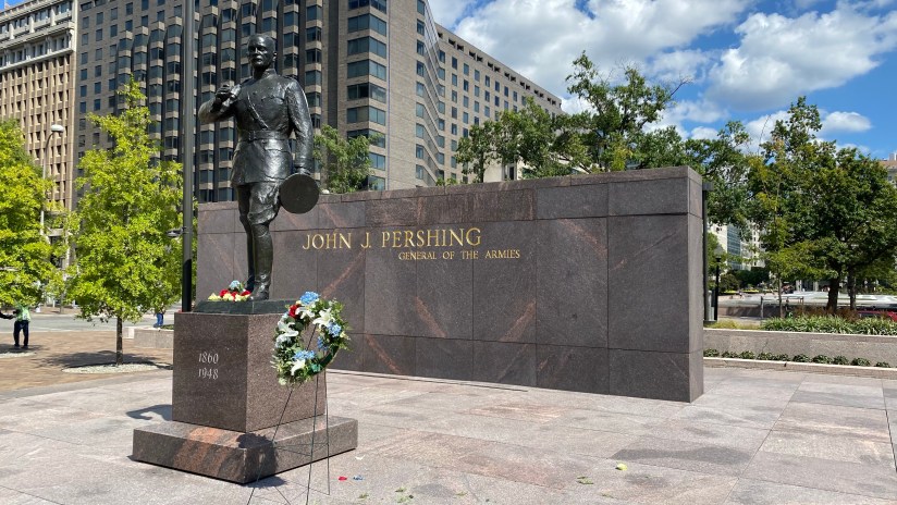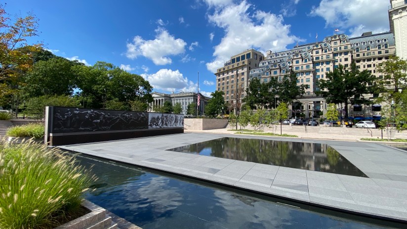 I had one final place on my agenda for the day, so we hoped the DC Circulator bus that goes around the National Mall area to get closer to the Dwight D. Eisenhower Memorial. This is one of the newest memorials in DC, established in 2020. Upon arriving, the employee of the gift shop had stepped away, so we waited for about twenty minutes for the store to reopen as I wanted my stamp.