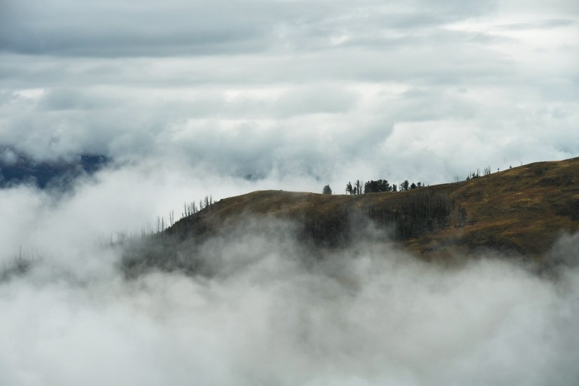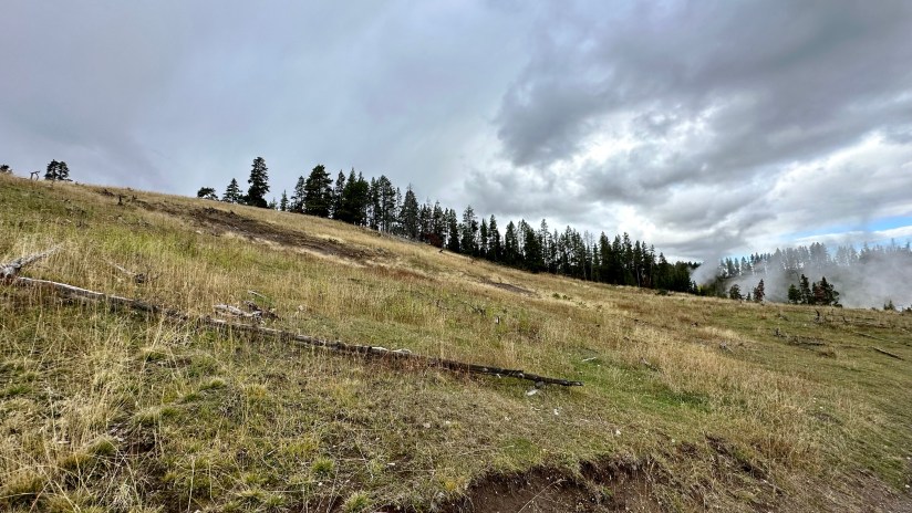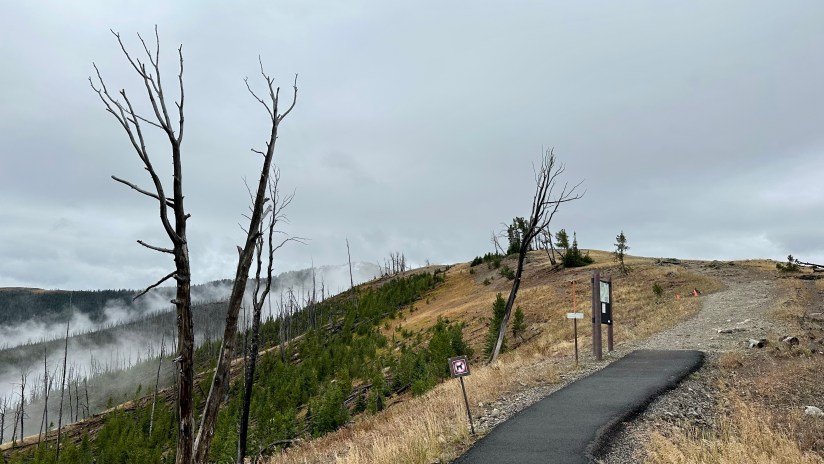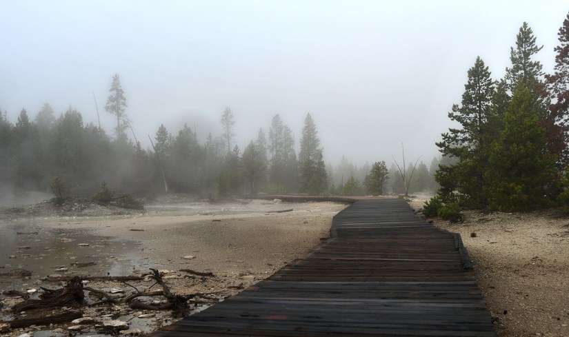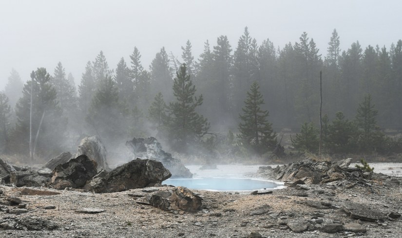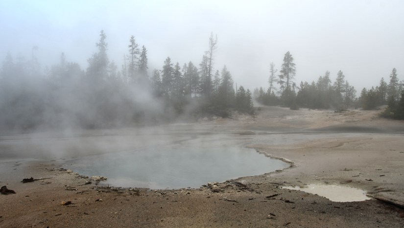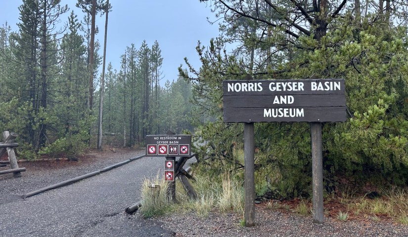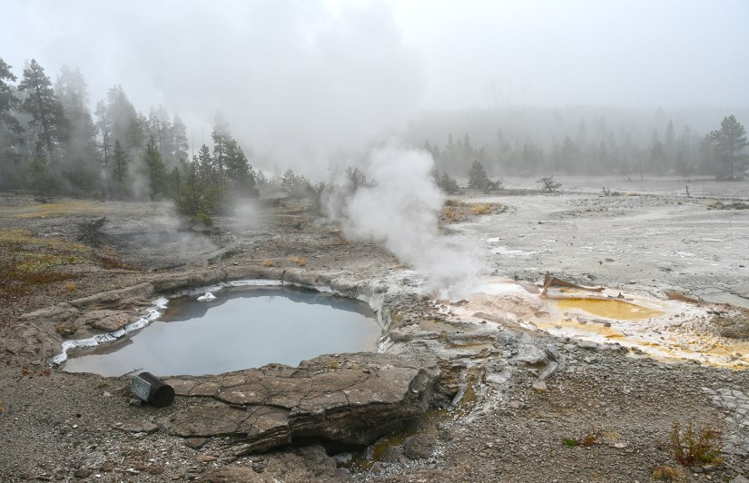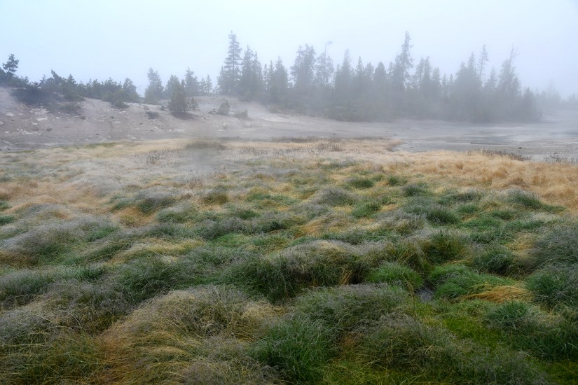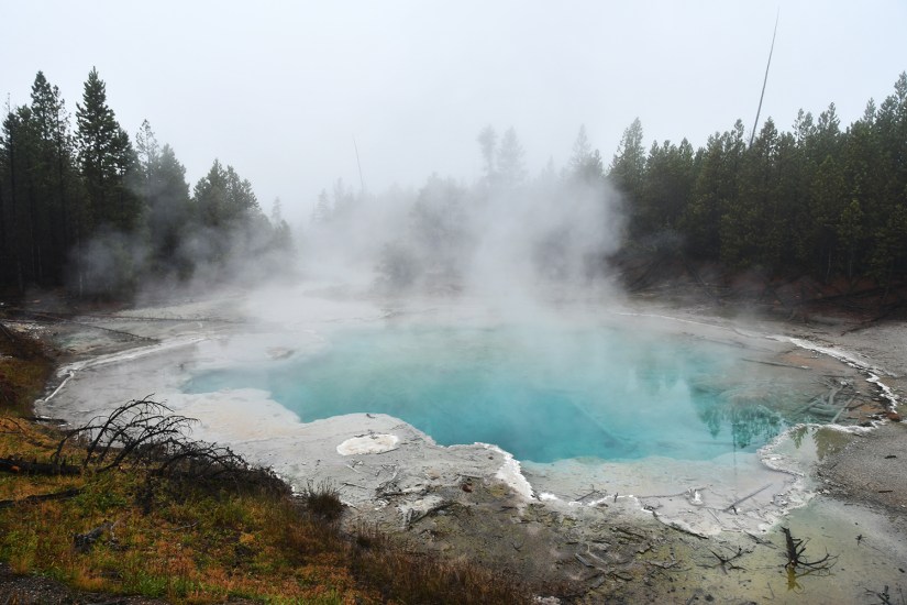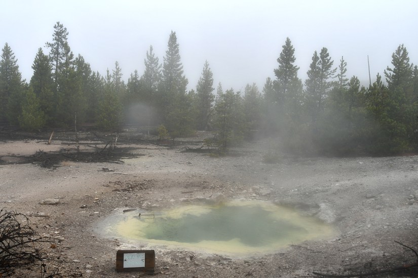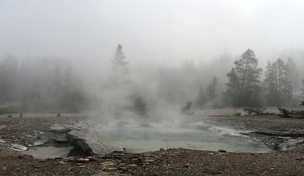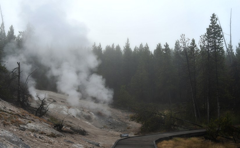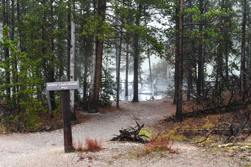The final full day in Yellowstone arrived as we crawled out of the rain soaked tent that was thankfully still keeping us perfectly dry inside despite being solidly drenched for four nights. It seemed like the precipitation was holding off, so we quickly packed up the wet tent as best as we could, and set out east towards Norris Geyser Basin.