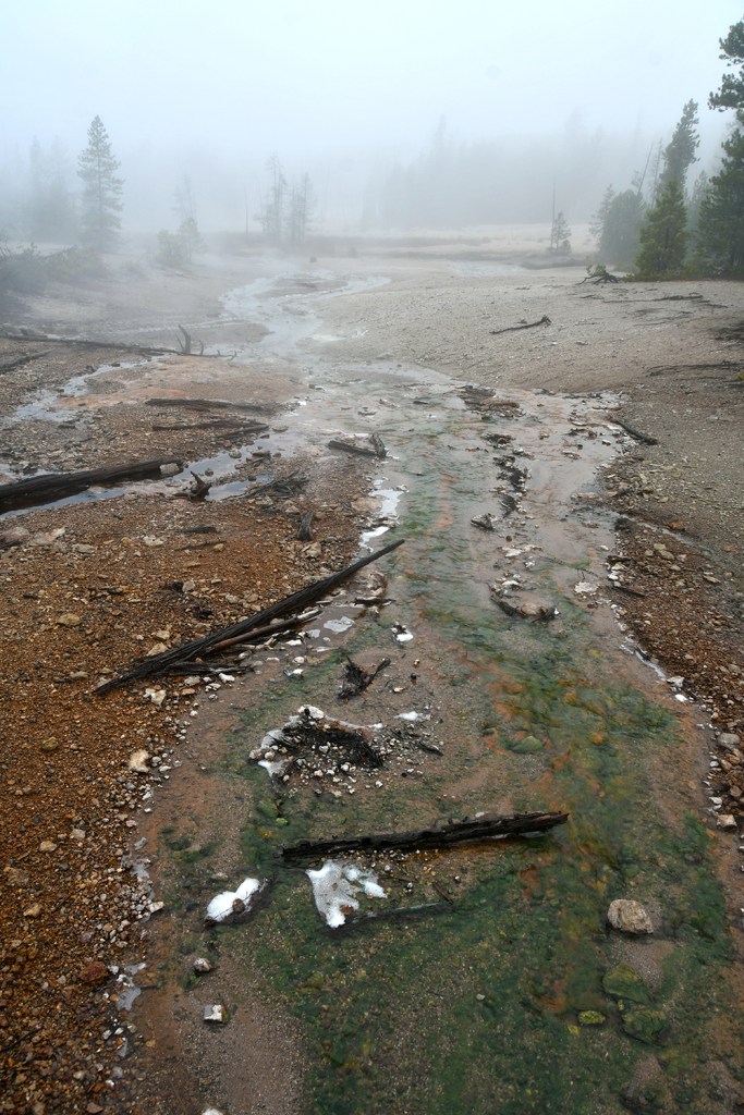 We did a clockwise loop at Porcelain Basin, which was still encased in thick steam and fog. Porcelain Spring was a bit secluded as a result, though in the minutes we spent the sun burned off some of the fog and it was becoming more vibrant. However, I was a bit disappointed that many of the pools were brown instead of blue from silica, and kept swearing to Eric it looked much different in my prior trips.