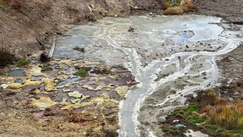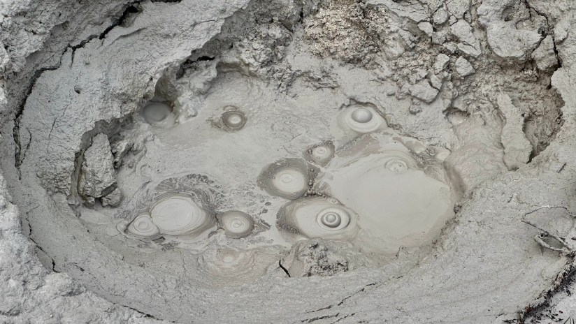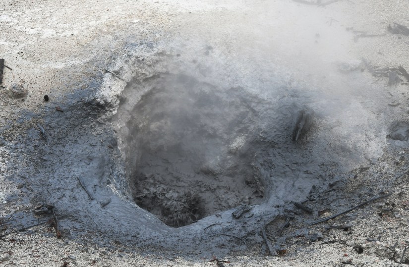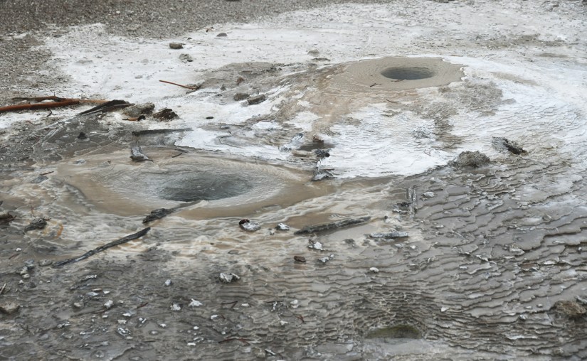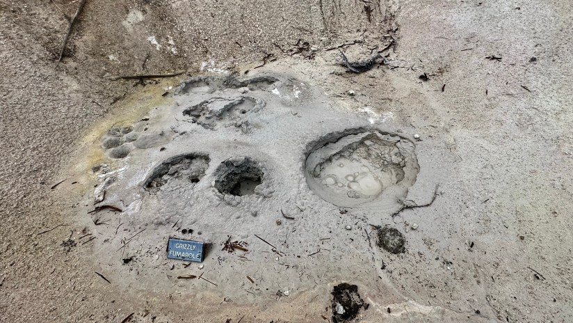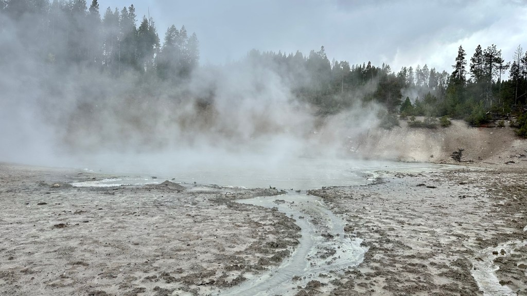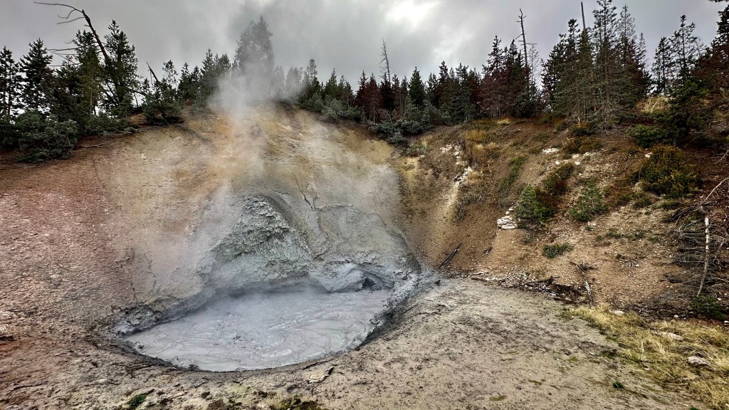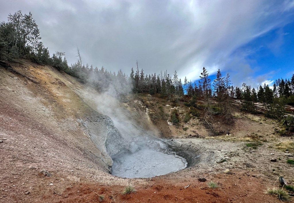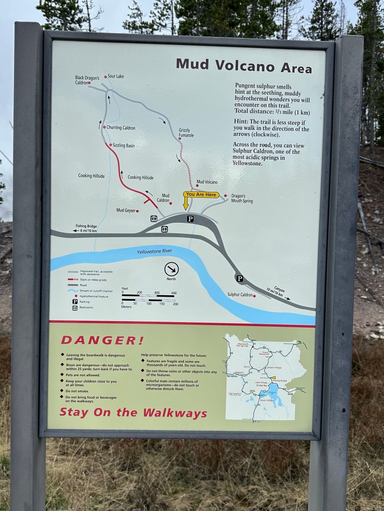 Mud Volcano is just seconds down the road from Sulphur Caldron. This is a thermal area near the Sour Creek Resurgent Dome, one of the areas the Yellowstone caldera experiences ground deformation due to the magma chamber underneath it (meaning the ground moves up and down, and thus, this area is highly monitored). It is about a one mile walk to explore all the boardwalks from the parking lot, and some of my favorite features of located here. If you want to get nerdy about the status of the Yellowstone volcano, the Yellowstone Volcano Observatory social media pages puts out monthly updates on earthquakes, ground deformation (measured by GPS), and status of hydrothermal features, like Steamboat Geyser eruptions. They also publish an annual report, and it is for sale in some of the gift shops in Yellowstone – I bought my 2021 annual report at the Albright Visitor Center in Mammoth.