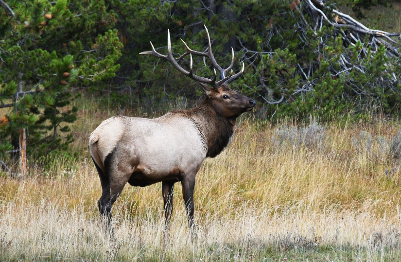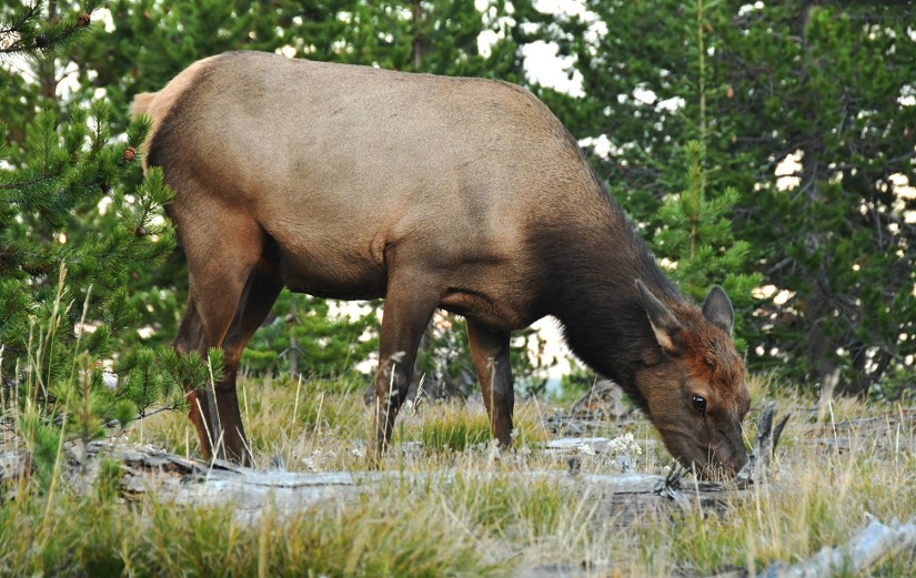 Leaving Fishing Bridge, there was a bull elk eating close to the road, so we found a safe place to park off the road, and joined the camera-equipped crowds for some photos.