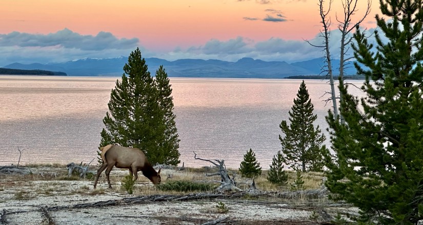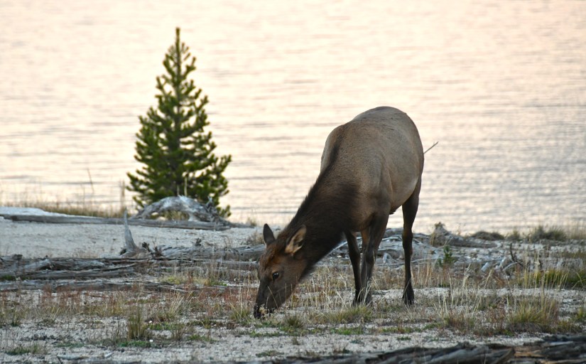 Just down the road we reached the Lake Shore Group, another thermal area next to the road that has no boardwalks or entry, but still some views of some thermal features. There was a cow elk having her evening meal under the sunset, and thanks to me being stopped on the side of the road, this meant every other car had to stop, too! (Life goal checked off the list – create a traffic jam in Yellowstone! Ha!) After jokingly yelling out “Ma’am, you can you please move, you are blocking the sunset!” to the elk, I wandered down the fence line for a better view of the thermal features, away from the crowds.
