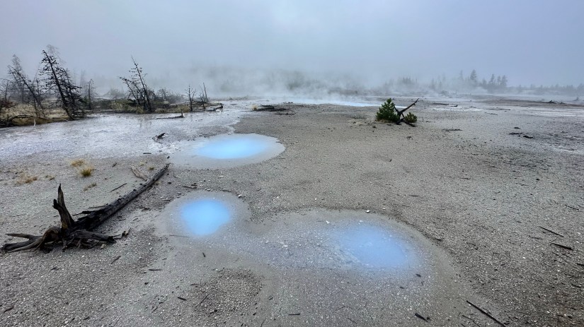 Eric and I were one of the first cars to arrive in the parking lot, and the garbage truck was the only activity going on. I quickly boiled some water so we could take our coffee to go as we meandered on the miles of boardwalks. Norris Geyser Basin is divided into two basins for boardwalk purposes (but really it’s all the same geyser basin system), the Back Basin and Porcelain Basin. I figured we would start with the Back Basin to give the sun some time to rise and burn off some steam before hopefully ending with a bang at Porcelain Springs, which in my opinion is one of the most unreal places on Earth. We made our way straight to Steamboat Geyser. During my visit last year the boardwalk was icy, and I was slip and sliding all over the place, but luckily there wasn’t as much ice, and I was wearing Crocs, which are grippy. Check hiking in Crocs off the bucket list…