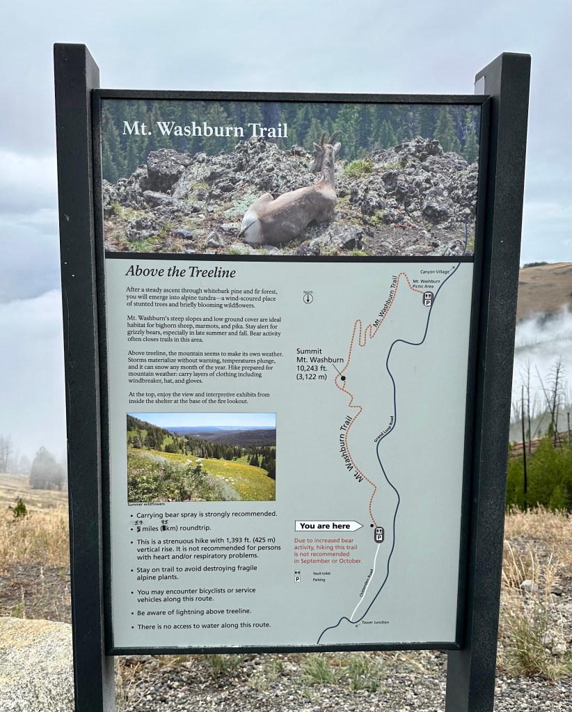 After Norris it was time to head towards Dunraven Pass to hopefully hike to the summit of Mount Washburn. Most of Yellowstone’s higher peaks have quite the approach and are best done as backpacking trips – Mount Washburn is one of the exceptions. This 10,219 foot peak (and former volcano in the Absaroka Range dating back 50 million years) is a popular hike because the summit can be reached by two trails that are pretty gentle in terms of mountain climbing. The first option is the Mount Washburn Trail that leaves from Dunraven Pass, and the second is Chittenden Road. Both are wide paths that are never crazy steep, and bicycles are allowed on Chittenden Road (though it is gravel and can get quite chunky, in my cyclist opinion a mountain bike would be best, or a gravel bike if you are experienced with descending on chunky rocks and gravel). On the summit of Mount Washburn is one of three remaining fire lookout towers in Yellowstone as well, and it is staffed during fire season.