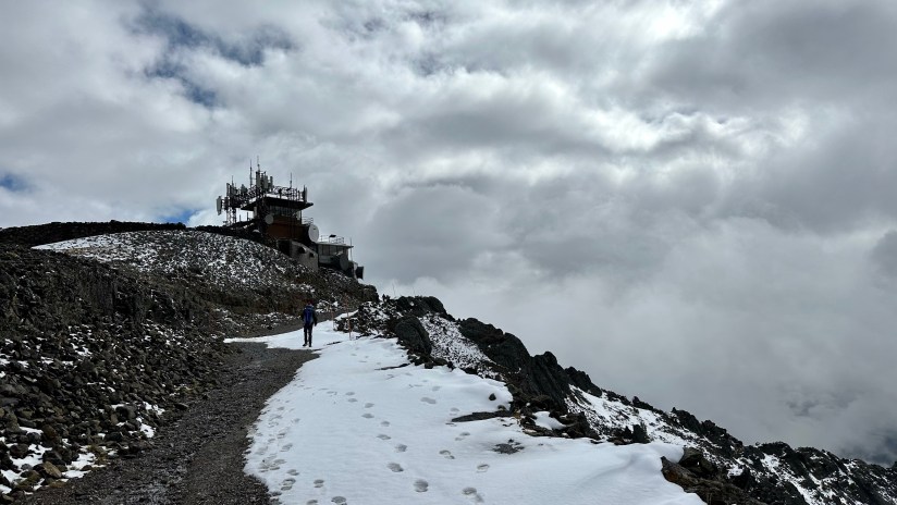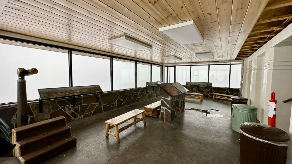The hike started out overcast, but once we got near the summit light snow started falling. We lucked out, and on the summit we had a few minutes of great sunshine before the mountain was swallowed by clouds. The exhibit in the lower level of the fire lookout was open, so we took this chance to eat our snacks inside and read the exhibits. In the summer months when the lookout is staffed, you can go up to the upper levels. Myself, and others on the summit, also took advantage of the incredible cell service to check in with those at home! I later learned a lot of the communication equipment for the GPS and other volcano monitoring systems is located on Mount Washburn – so there’s not just good service cell service so tourists can Instagram their selfies, ha!