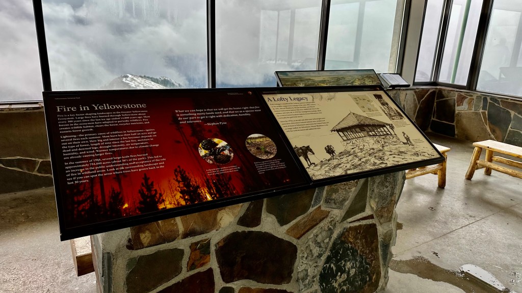 We wrapped up Norris by stopping into the educational displays, which describe why this geyser basin is unique. The ranger had just set up her desk outside, so I asked if she had the passport stamp (the bookstore had just closed for the season), and she graciously went to retrieve it from the store. I was left “in charge” of the ranger desk for a minute, which was exciting stuff! Ranger for a minute!