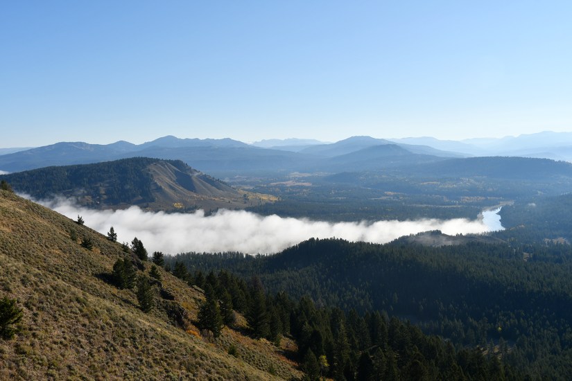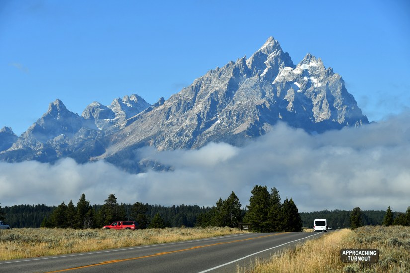 First up after getting into Grand Teton National Park was the drive up Signal Mountain, a 7,727 foot mountain that provides some great views over Jackson Hole and the Tetons. There was a strong cloud inversion going on, so this also provided the opportunity to pop out of the clouds and prove to Eric there really are big pointy mountains in this area (recall on the first day, there was strong cloud cover on the summits, so we had yet to see the whole mountains this trip). You can hike to the top of Signal Mountain on a 6.8 mile roundtrip hike, or take the road up and park very close to the summit. The road sounded like a lovely idea!