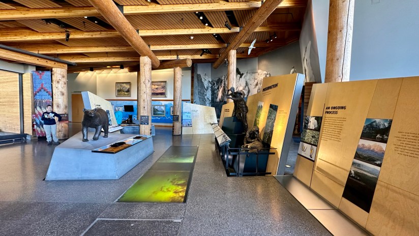 We meandered about a mile or so along the lake, taking plenty of photos and watching the clouds lift and more of the landscape come into view. Next up was continuing south to the Craig Thomas Discovery and Visitor Center right after the Moose entrance station. This is a great visitor center with wonderful exhibits, a ranger desk, and a large gift shop.
