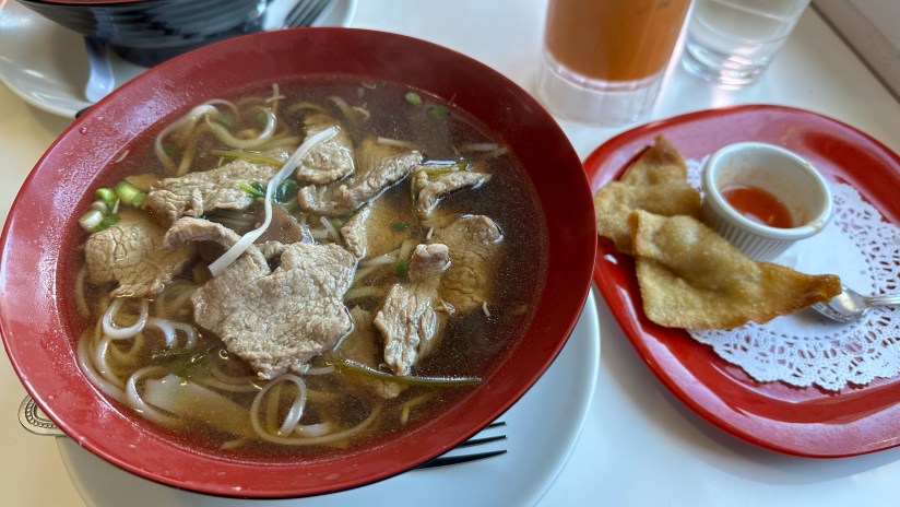 I opted to get beef noodles soup (kind of like pho) and a big order of fried chicken and shrimp wontons. Eric also opted for the soup, but made a lot spicier, and an order of spring rolls since my wontons were ridden with gluten. It wasn’t shabby, but definitely not the best Thai I’ve had – I probably should’ve chosen something a bit more Thai and little less pho-ish as I tend to be disappointed in pho-ish soups outside of Vietnamese restaurants. On the bright side, the restaurant is across the street from a stupidly expensive hotel (like $800+/night), and Eric and I were quite entertained by watching the valets and hotel guests and coming with stories about them. People watching at its finest!