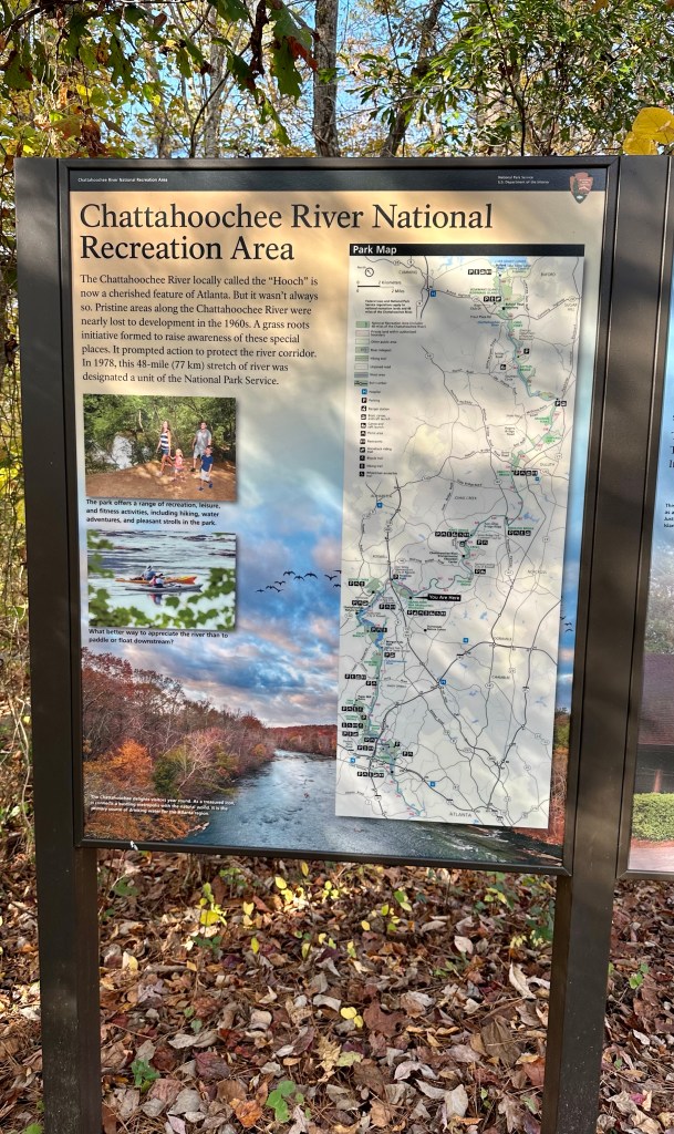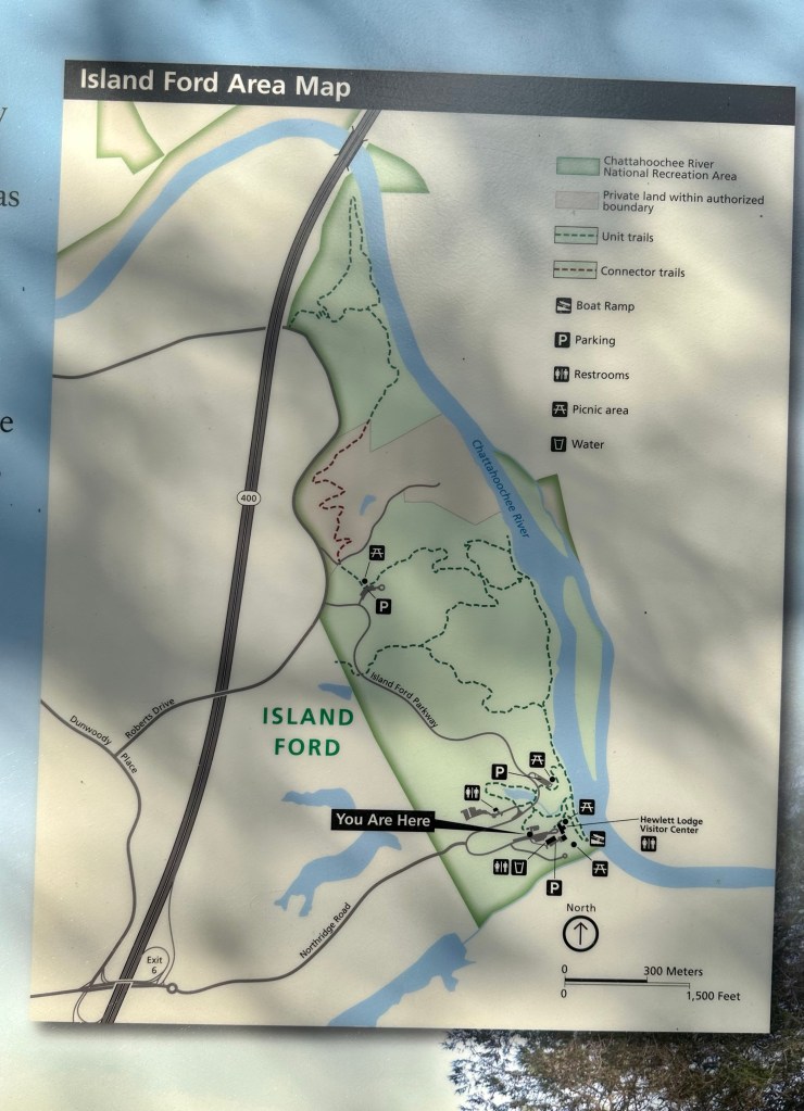 The Chattahoochee River National Recreation Area was established in 1978 and covers 48 miles of the river in the Atlanta area. There are fifteen water and land units that make up the recreation area. The visitor center and ranger station is in the Island Ford unit, which is located near Sandy Springs. The visitor center is open 9am-5pm daily, and has a small gift shop and passport stamps. Island Ford itself is open dawn to dusk daily. GPS services, like Google Maps (and whatever Uber utilizes) will try to take the shortest route, which leads to a gated road. It is best reached by by utilizing the “8800 Roberts Drive, Sandy Springs, GA” point, and then turning down the paved road and following Island Ford Parkway to the end by the visitor center. (maybe a mile or so?).