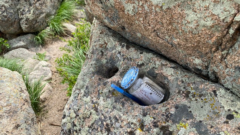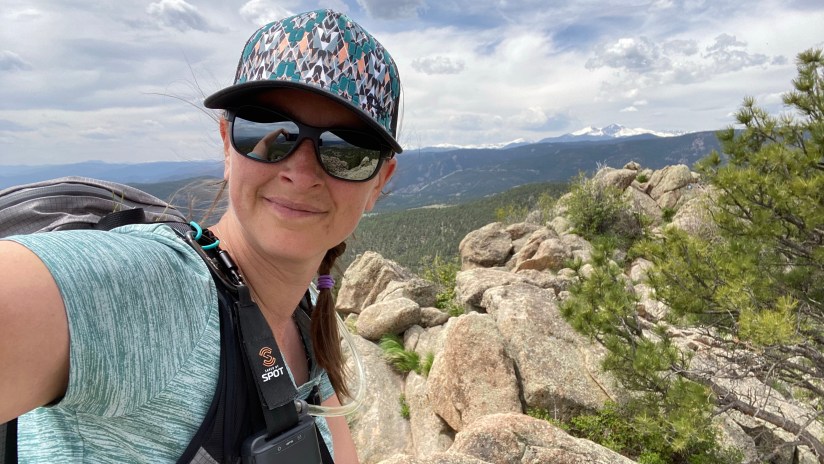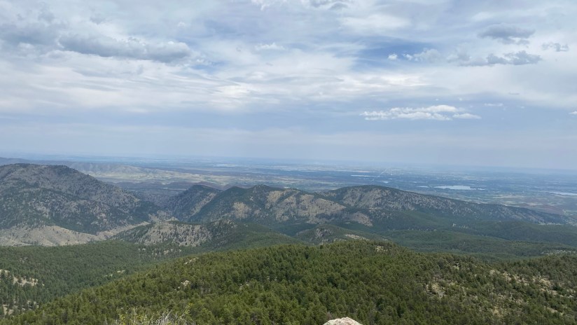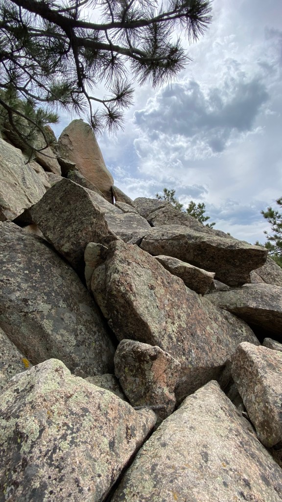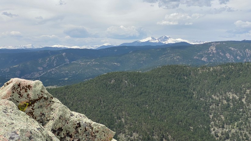 The summit of Stone Mountain is 7,655 feet, and unlike Sheep, is open and exposed so there were great views towards Rocky Mountain National Park, including Longs Peak and Mount Meeker. It was crazy windy when I arrived on the top – like blow you over windy – so it was a bit hairy to traverse the rocks to the highest point. I did find a summit register up top. After some quick photos, I carefully made my way back down (scrambling down is always so much harder) and back into the trees. Clouds were building, so I was happy to be in the trees for the rest of the hike back down to the car.