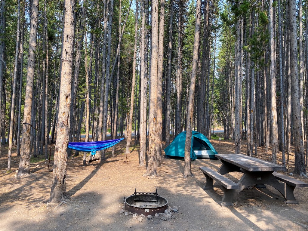 - E184: This is a large site found in the mixed RV/tent section. At first I was worried about being around RVs, but all the campgrounds in Yellowstone have quiet hour rules that limit generator use, so this site was quiet. This site has trees (hammock time!) but really is otherwise open and sunny. It was just a short walk to the bathroom and dishwashing facilities