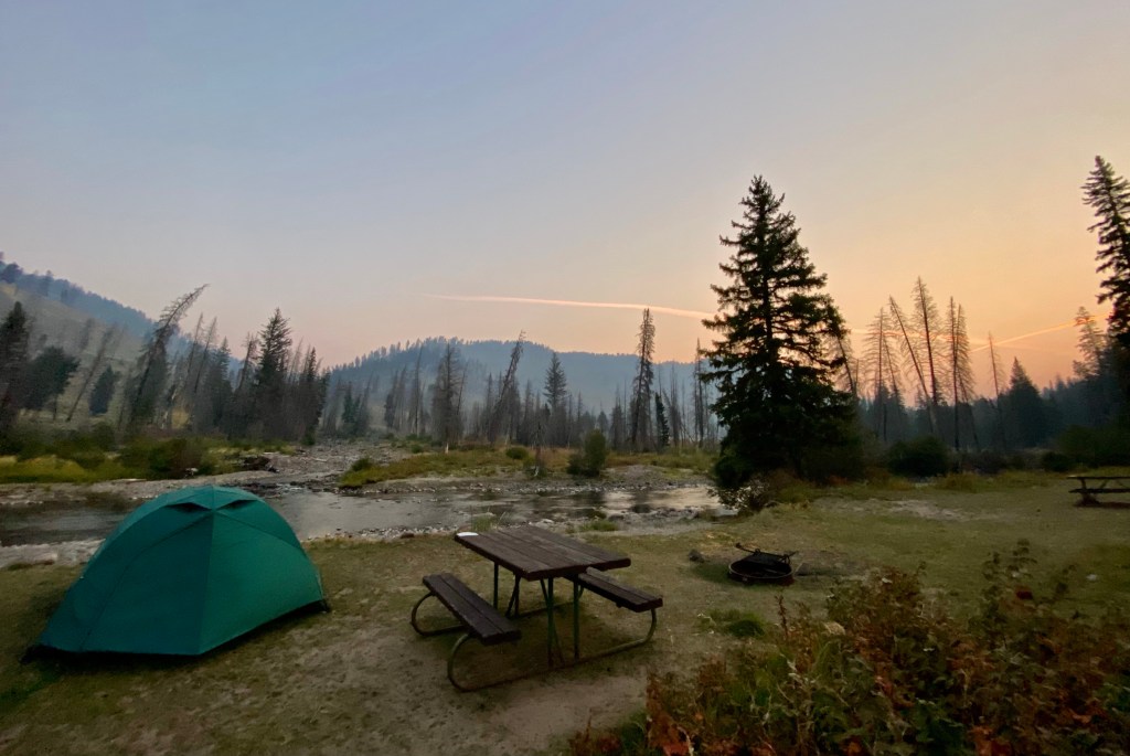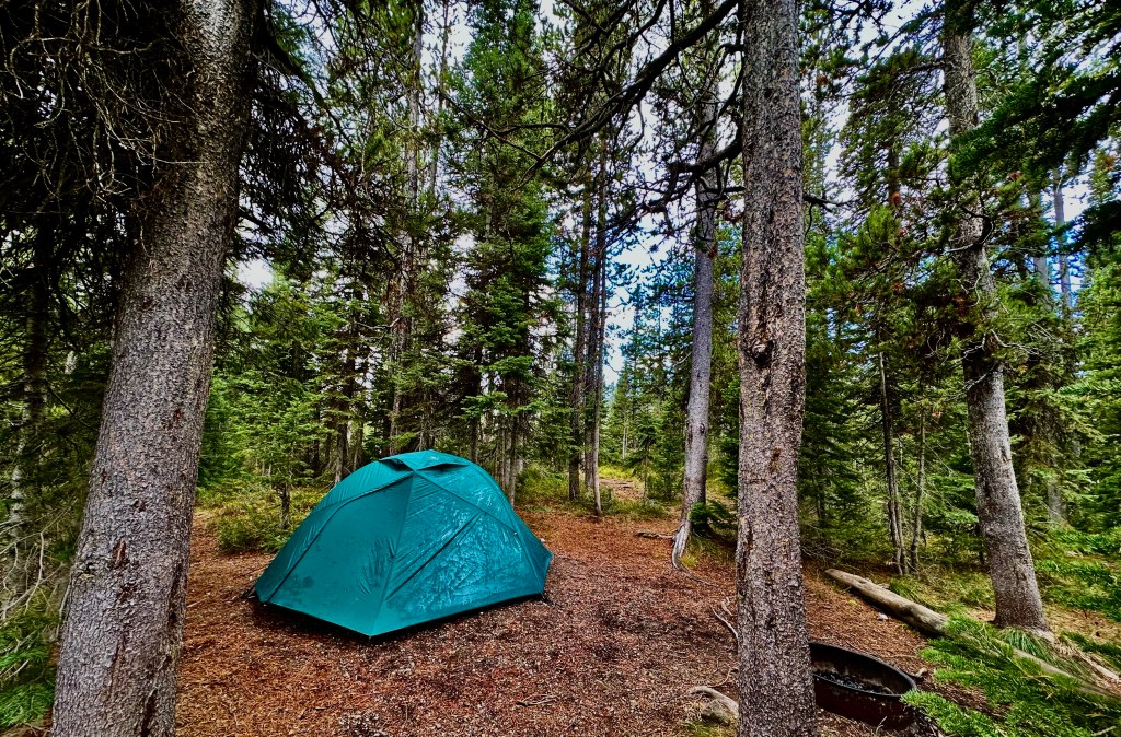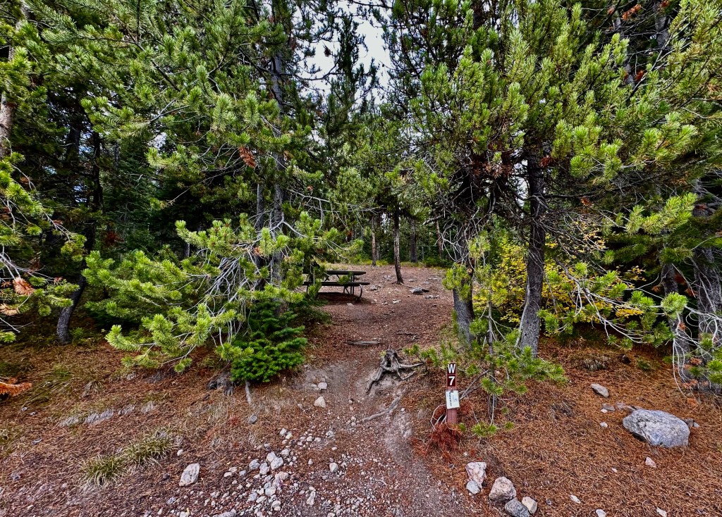 - D88 – This site is in a tent-only loop near the end. I was across from the bathroom facilities and dumpsters, but this didn’t really cause any problems, and I enjoyed the short walk to use the facilities and to wash dishes. This site fit my 3+ person tent perfectly, but would not be great for anything much larger in my opinion, as it would be a tight squeeze. I had tons of mature lodgepole pines, so I enjoyed some hammock time after dinner.