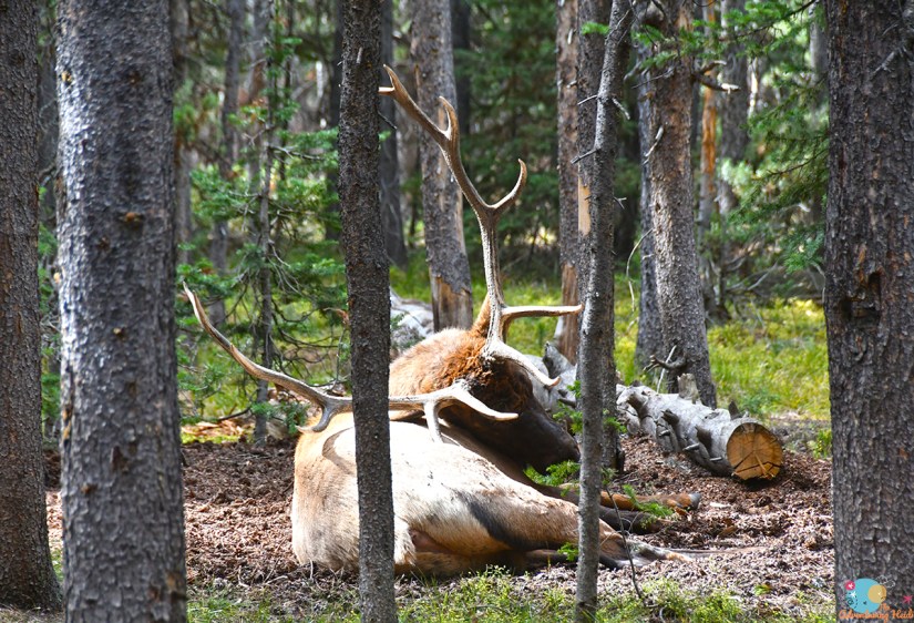 - J350 – In 2021, I stayed in the tent-only loop, and had a very large, private campsite, J350. After a cramped three nights at Madison, I felt like I had serious acreage! The site was covered in mature lodgepole pines, so I could enjoy some hammock time. I also had some protection from the rain that fell later that night. Probably the biggest downside to this particular campsite was the distance to the bathrooms and dishwashing station. I ended up just loading my dishes in my car, and when I headed out for some exploring, stopped by to wash my dishes on the way out. That is just my laziness coming through. Being Mid-September when I stayed here, the elk rut was going on, and there were numerous elk in the campground. I included a photo below of a big bull that was napping in the campsite next to mine!