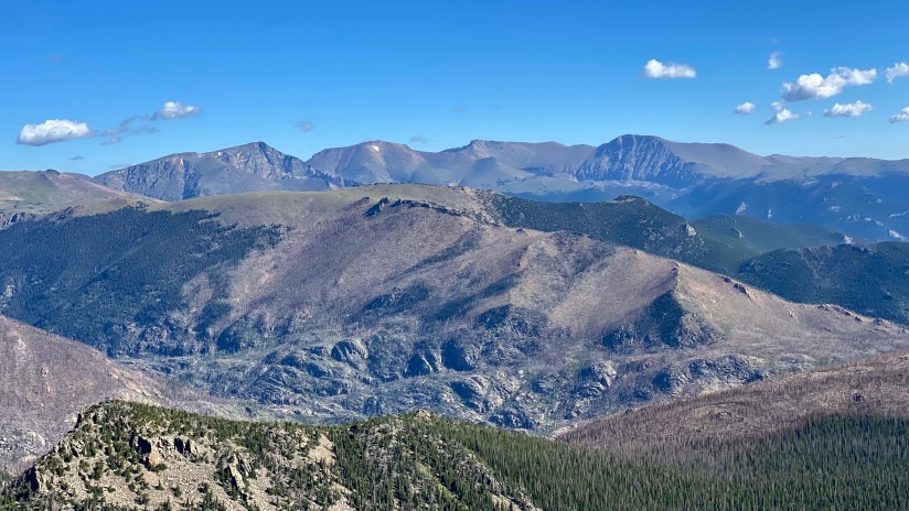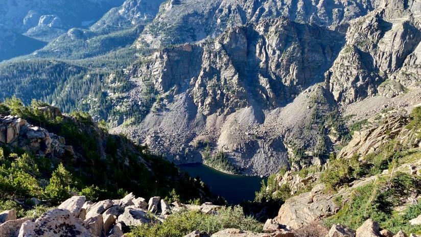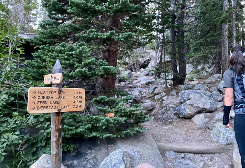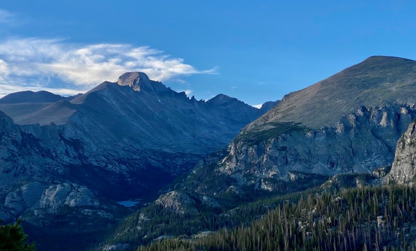 After about two miles the trees lessen and we approached the overlook down over Dream Lake, a very popular hike in its own right. We paused for photos, with me musing about Longs Peak and my plans to summit in a couple of weeks.