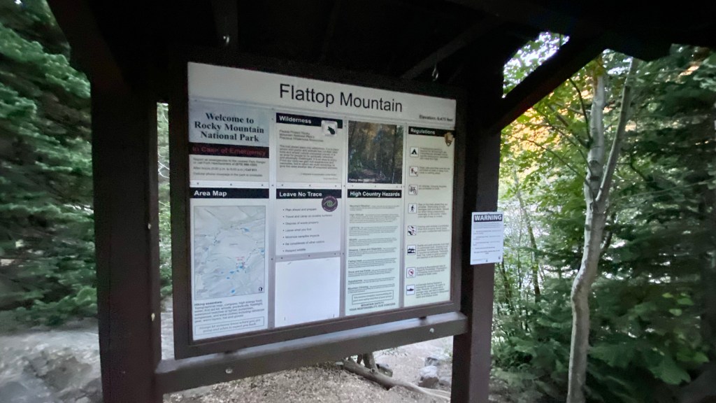 Special Considerations: This trail is located within Rocky Mountain National Park and entry fee is required. During the busy season timed entry reservations are in place. This trail begins in the Bear Lake Corridor, which has extended timed entry requirements. This area is incredibly popular, and often parking will be full by the early morning hours. There is a shuttle available for Bear Lake Corridor, and it is recommended to park there if arriving in the later morning hours in the summer. The Flattop Mountain hike is above treeline for an extended amount of time, so weather considerations are important.