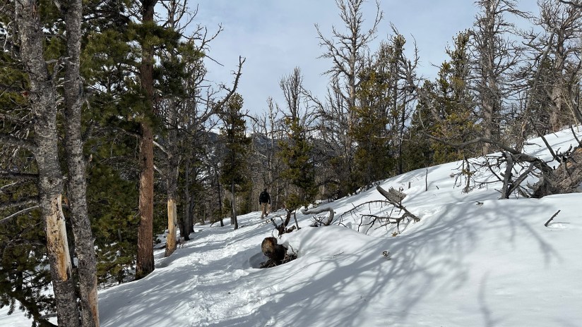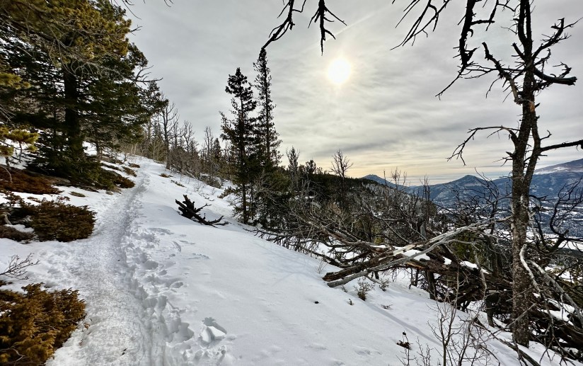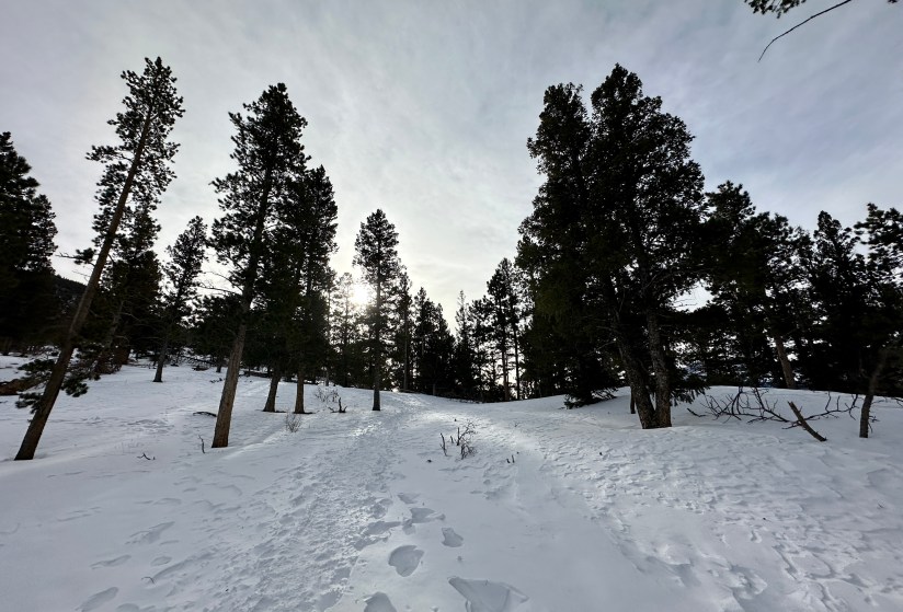 Knowing this is quiet a popular hike, even in the winter, I was happy for an early arrival at the Deer Ridge Junction Trailhead, which still had plenty of parking left (it would be full by the time we were done hiking!). Being early February and winter after all, the entire trail from the car to summit was on packed snow. I donned the microspikes, and laughed about how the forecast never said anything about hellacious winds.