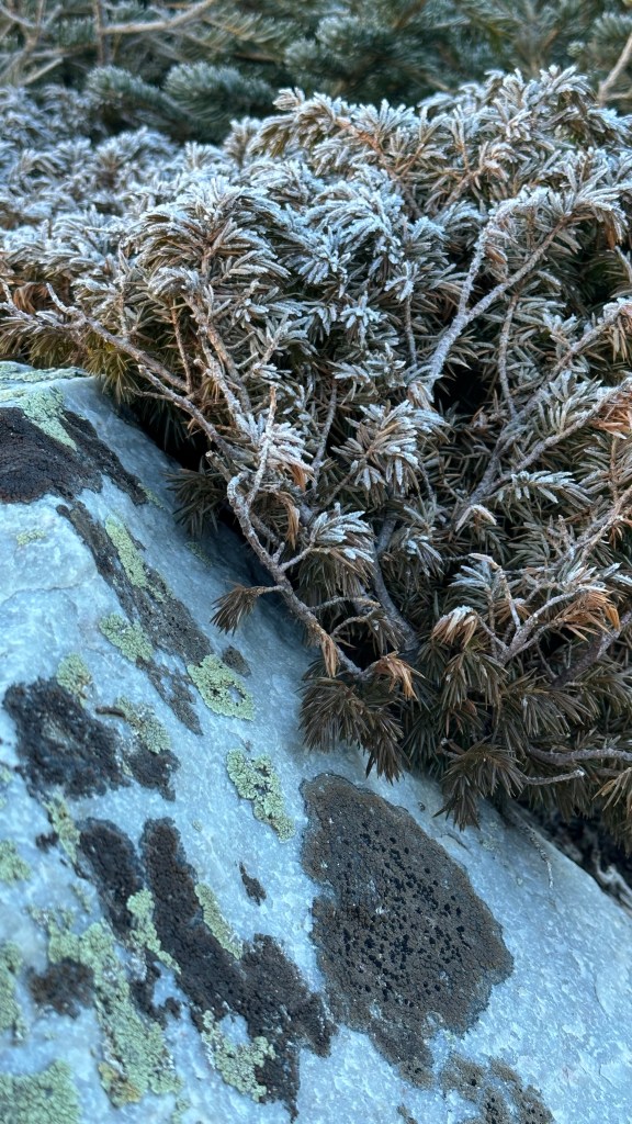 I headed north on the trail that heads to Gaps Lakes and Lost Lake. Frost covered plants in rocks in shaded areas, but I soon found myself stripping off layers. The masses had not arrived yet, so I enjoyed the solitude (in fact, I wouldn’t see anybody else until I was on my return leg at North Gap Lake).