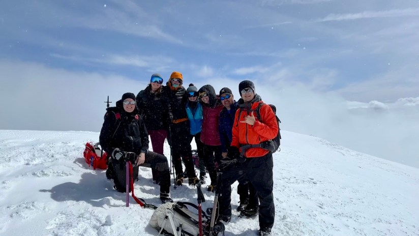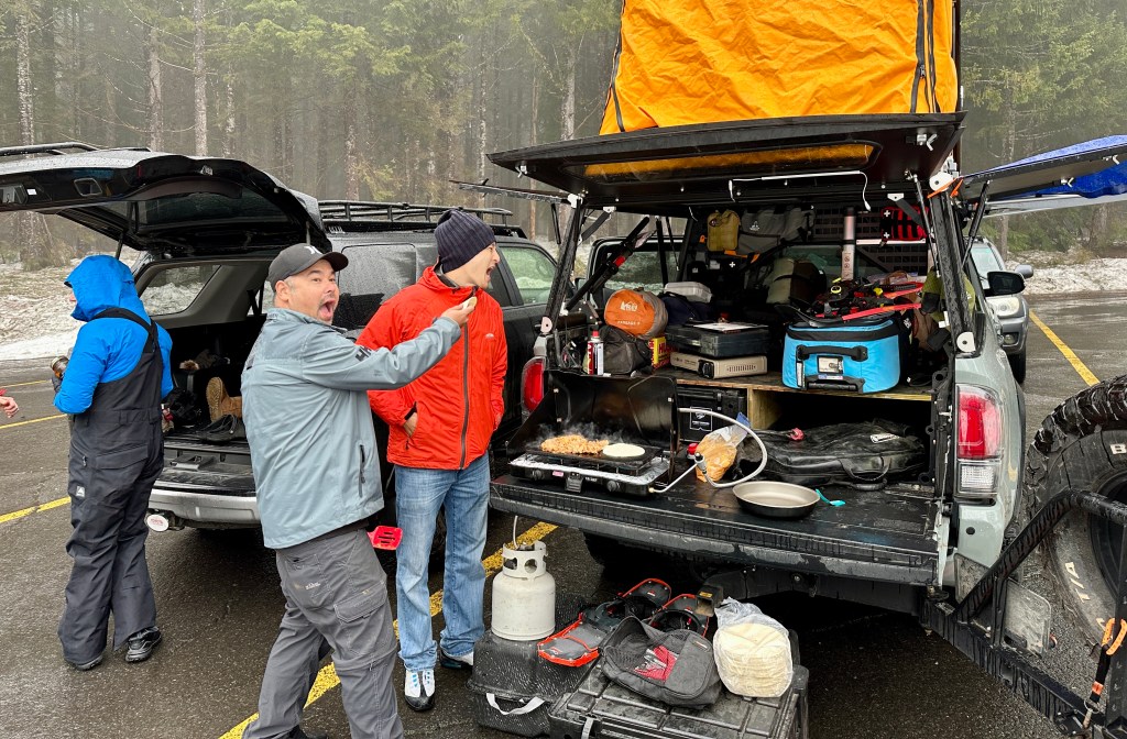The mountaineering boots were ripped off and I gingerly trained my toes on how to bend again before climbing up into the tent to change into dry layers (even with a Scooty Booty, my bum got wet glissading). We opted for chips, bacon, and guac in the parking lot as we waited for our whole group to return. Eric and I also drank our Crowne Royal Washington Apples that we took to the summit in honor of Kyle. I taught everyone prayer squat as a way to stretch out the muscles. Soon enough, everyone was off the mountain and accounted for. Phone numbers and photos were exchanged, and a random guy even showed up with Meredith’s missing microspike that came off while glissading. Spirits were high, despite exhaustion.